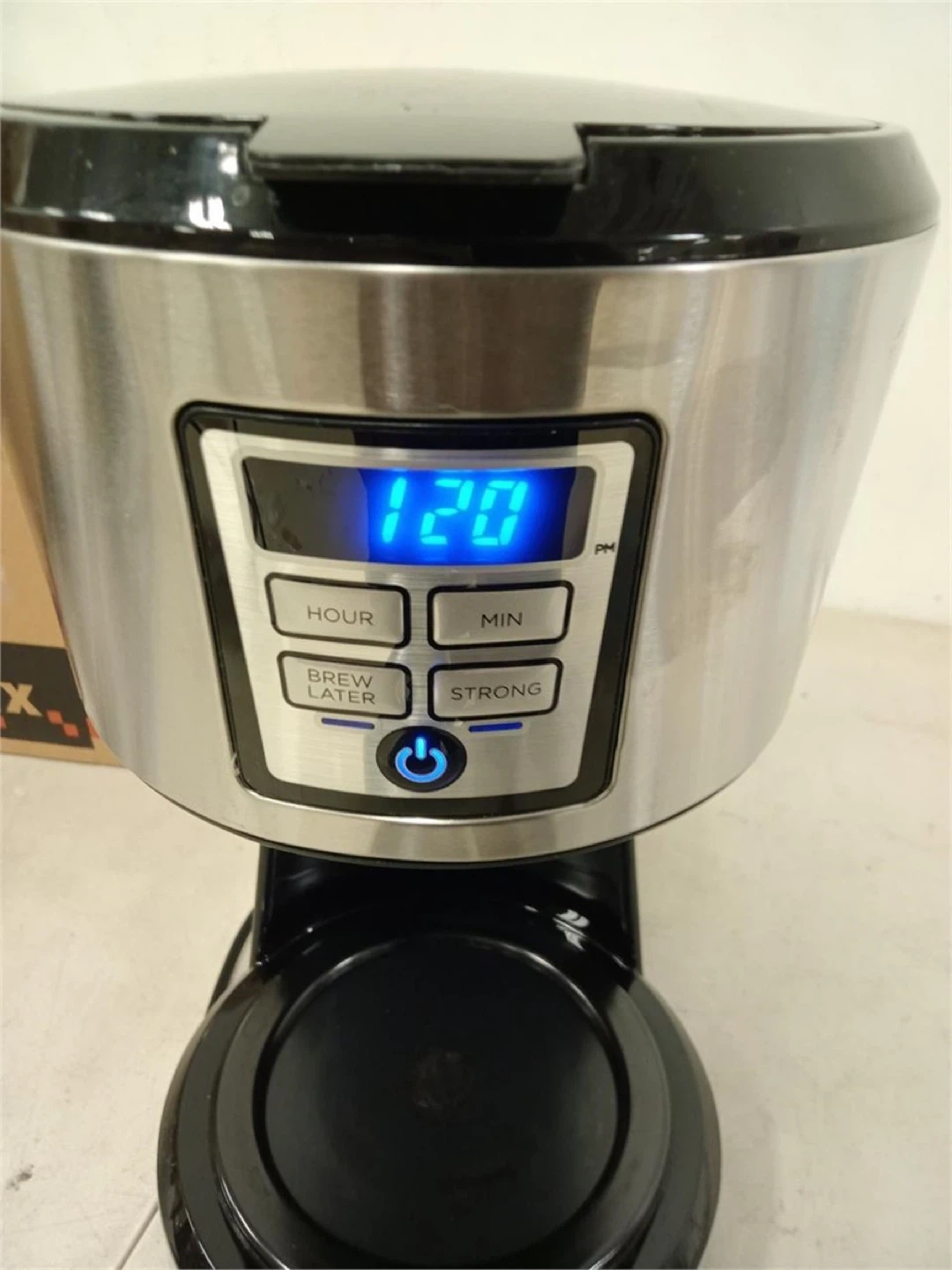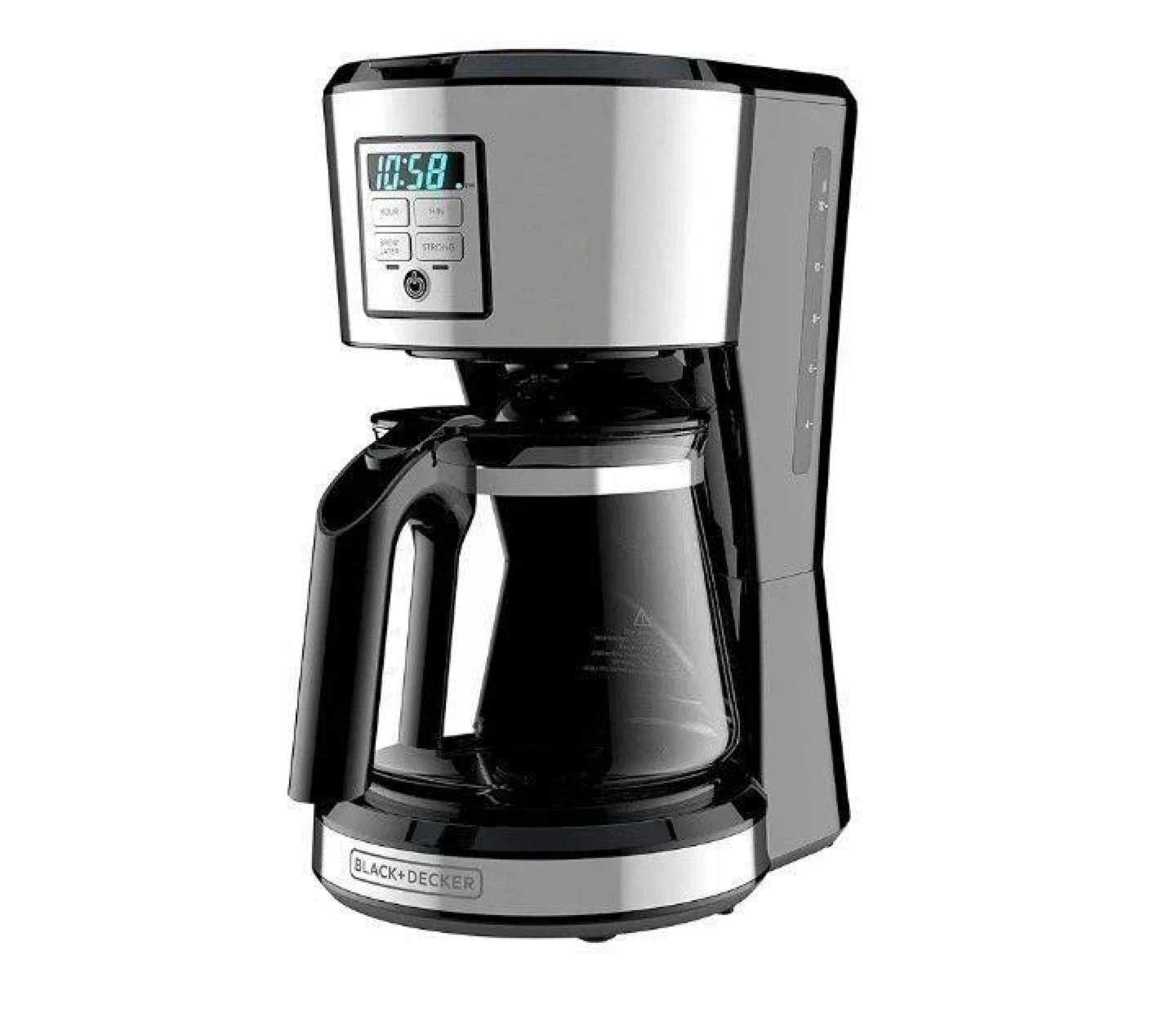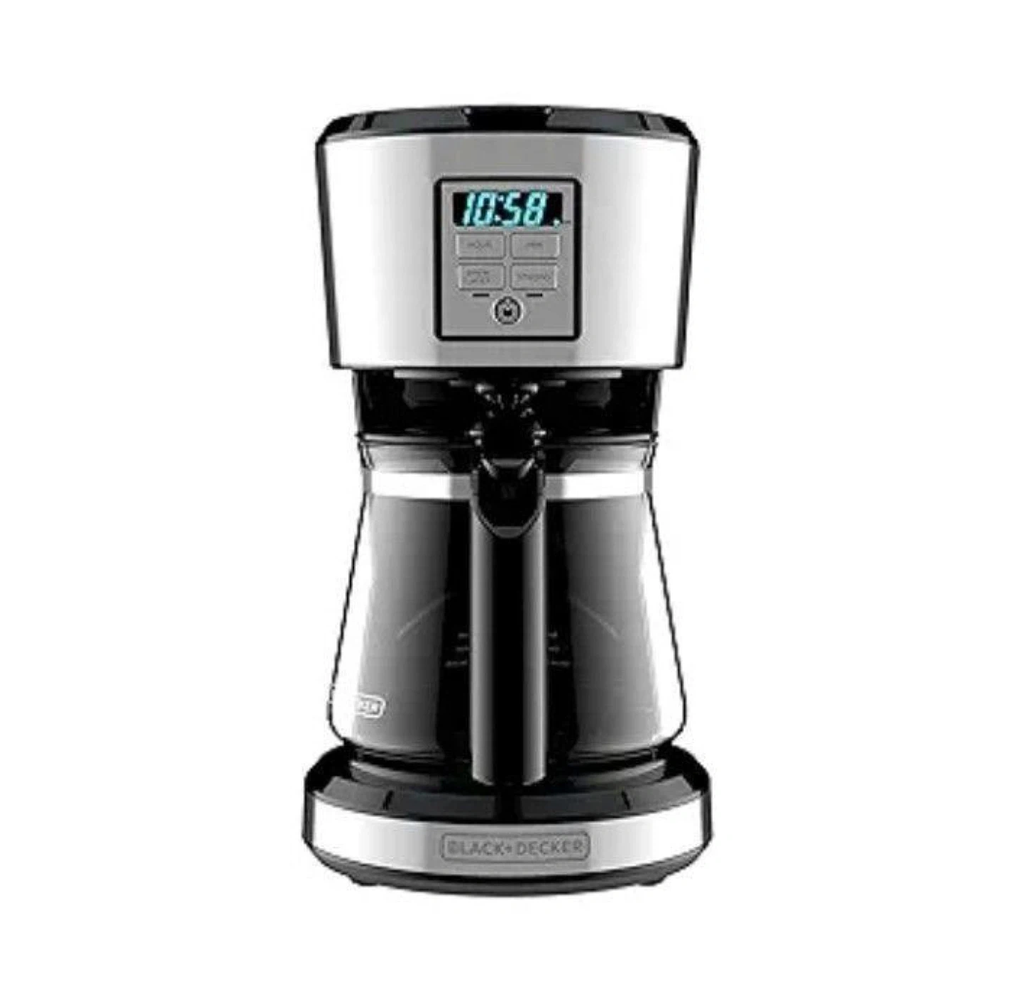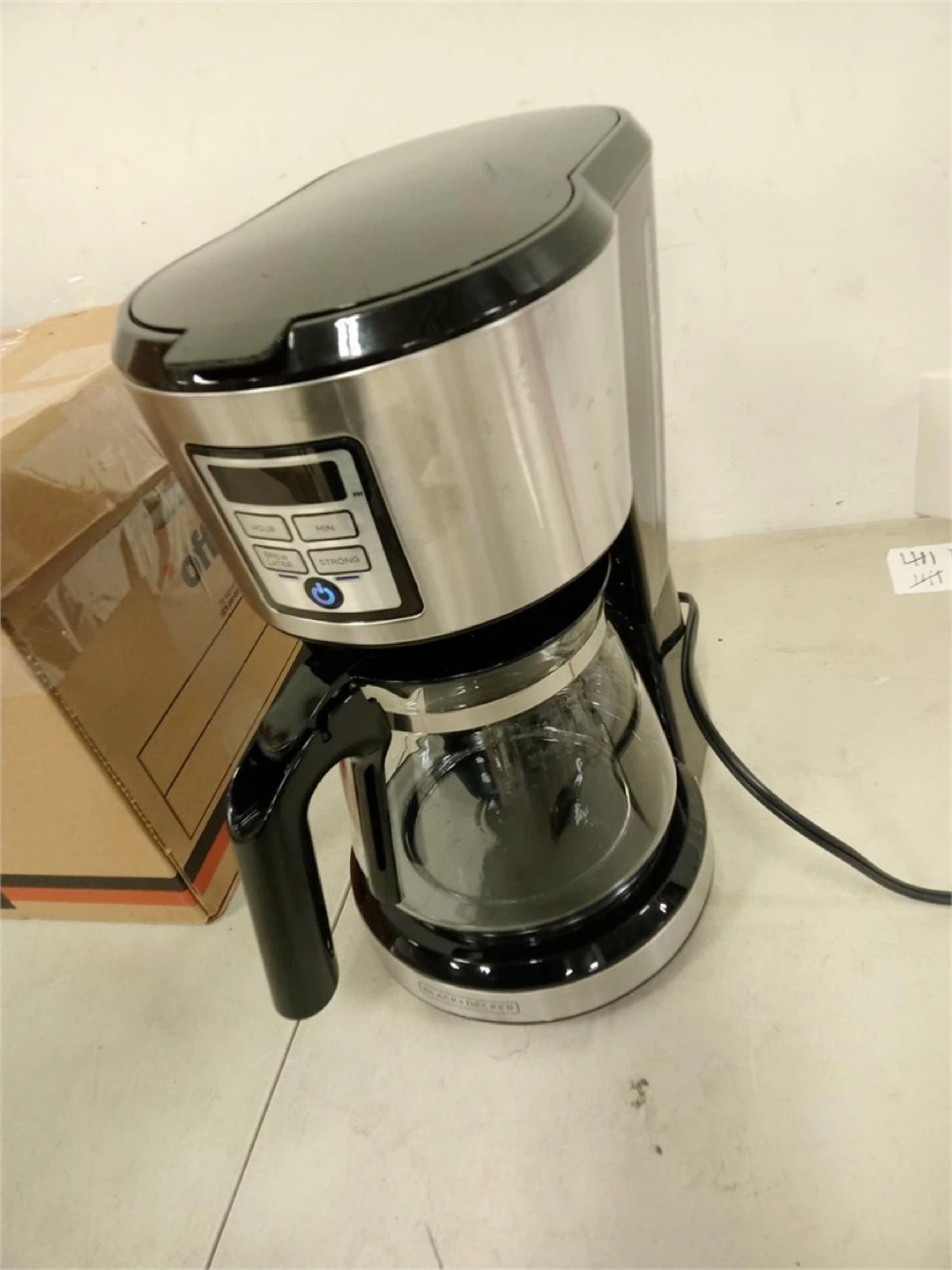 54Selling a Black+Decker 12-cup programmable coffee maker! It's in great shape and ready to brew your favourite coffee. It features a digital display and programmable settings for convenience. The carafe is glass, and the machine is black and silver in colour.