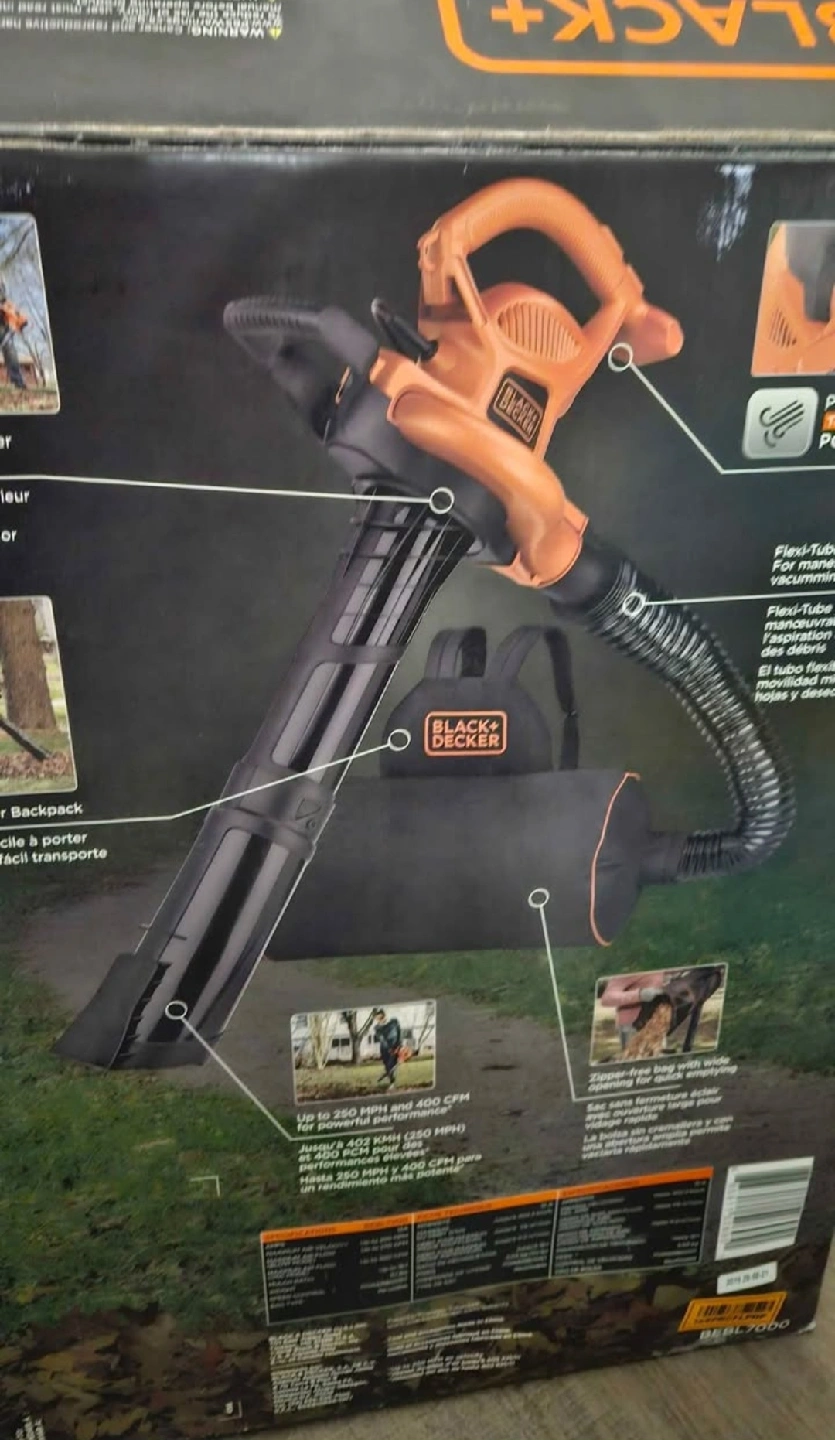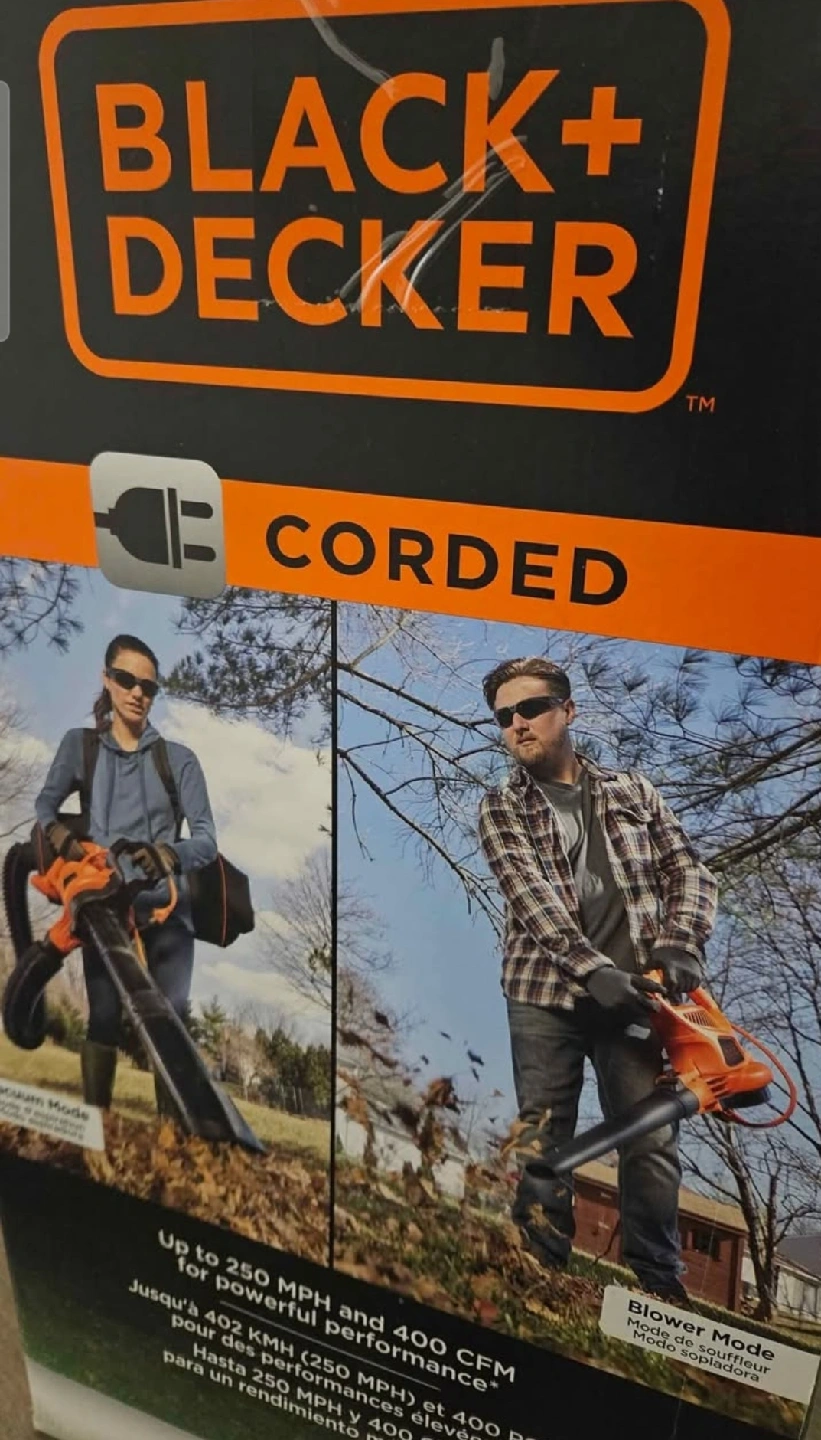 Selling a Black+Decker corded blower/vacuum. It can blow up to 250 MPH and 400 CFM for powerful performance. The bag is zipper-free with a wide opening for easy emptying. Great for yard work!