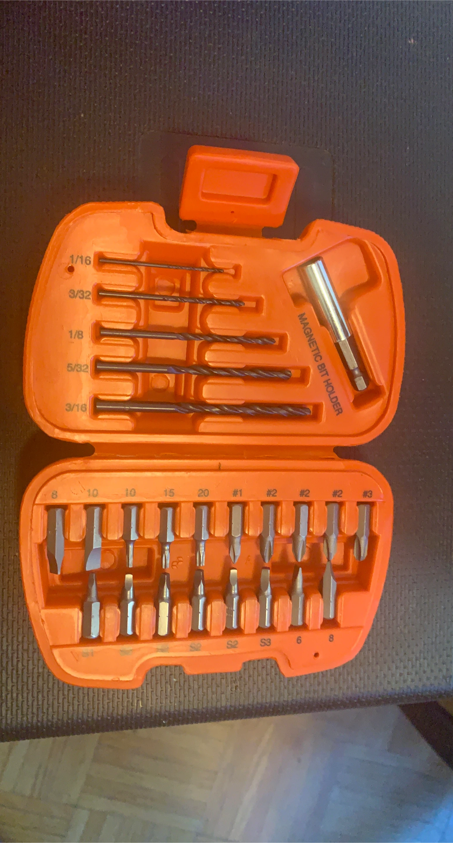 29Selling a Black & Decker drill bit set. It comes in an orange case with various drill bits and a magnetic bit holder. Great for any DIY projects around the house!