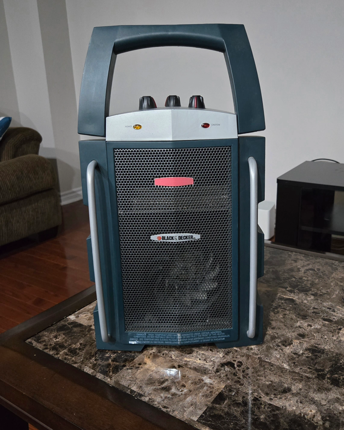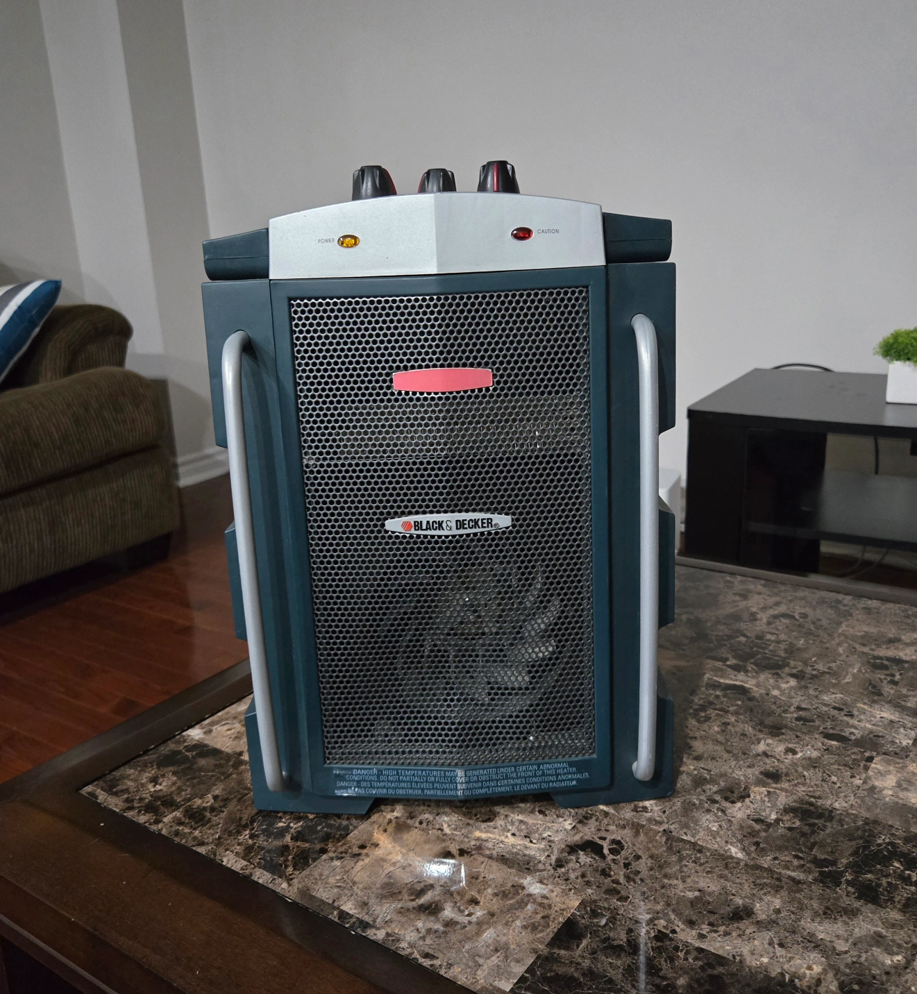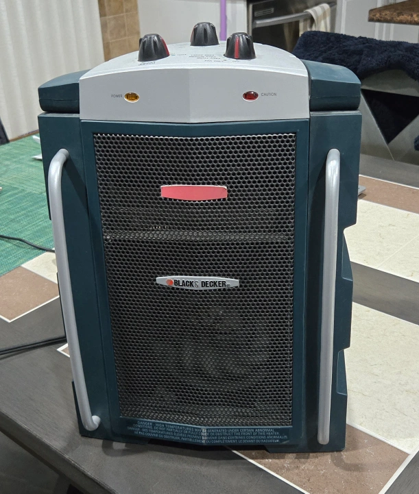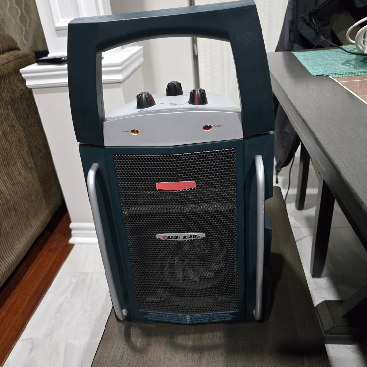 14Electric heater with two heat settings and a built-in fan. Includes carry handles.