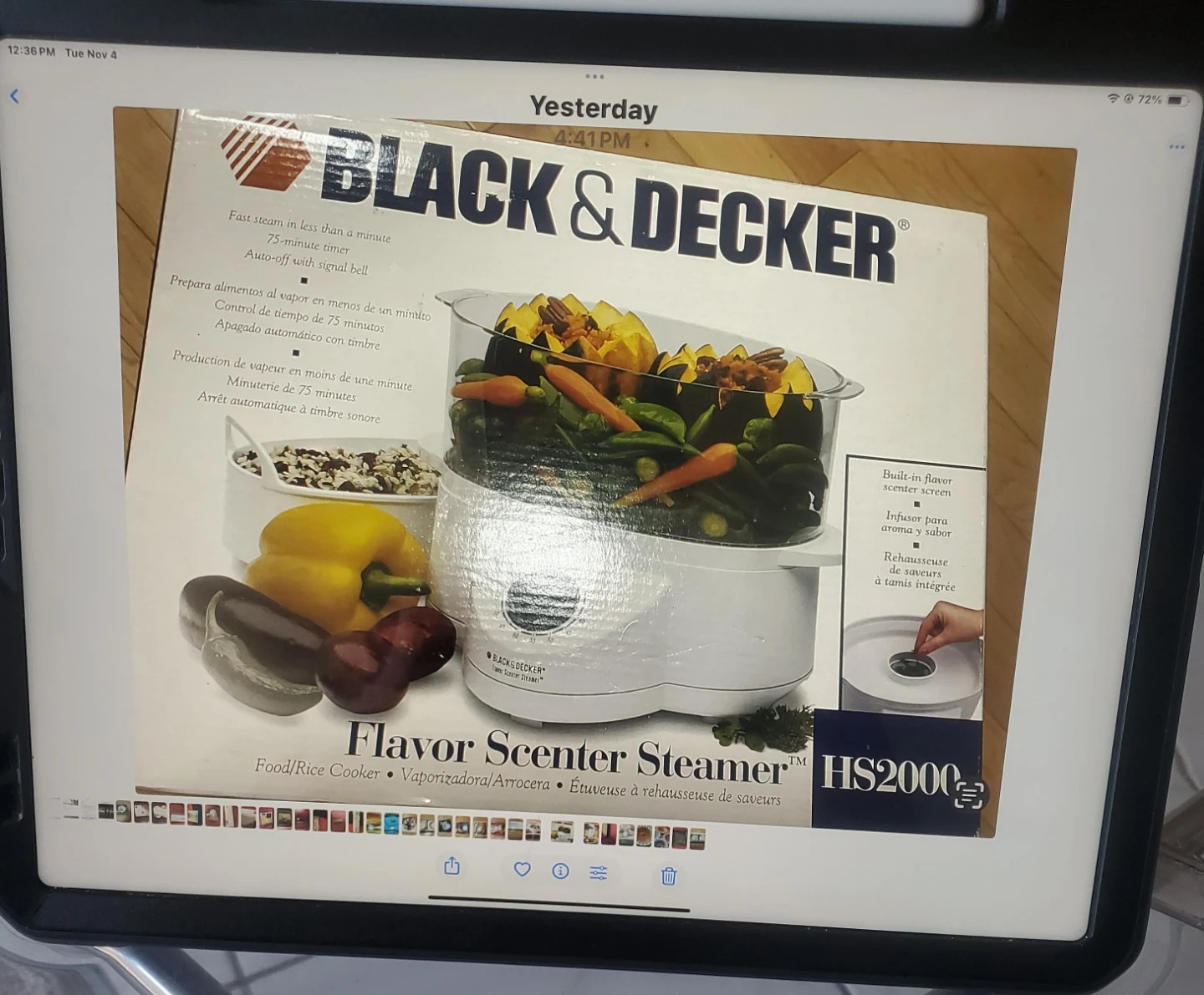 10Selling a Black & Decker Flavor Scenter Steamer, model HS2000! It's a food and rice cooker that steams in less than a minute with a 75-minute timer. It also has an auto-off feature with a signal bell, and a built-in flavor scenter screen