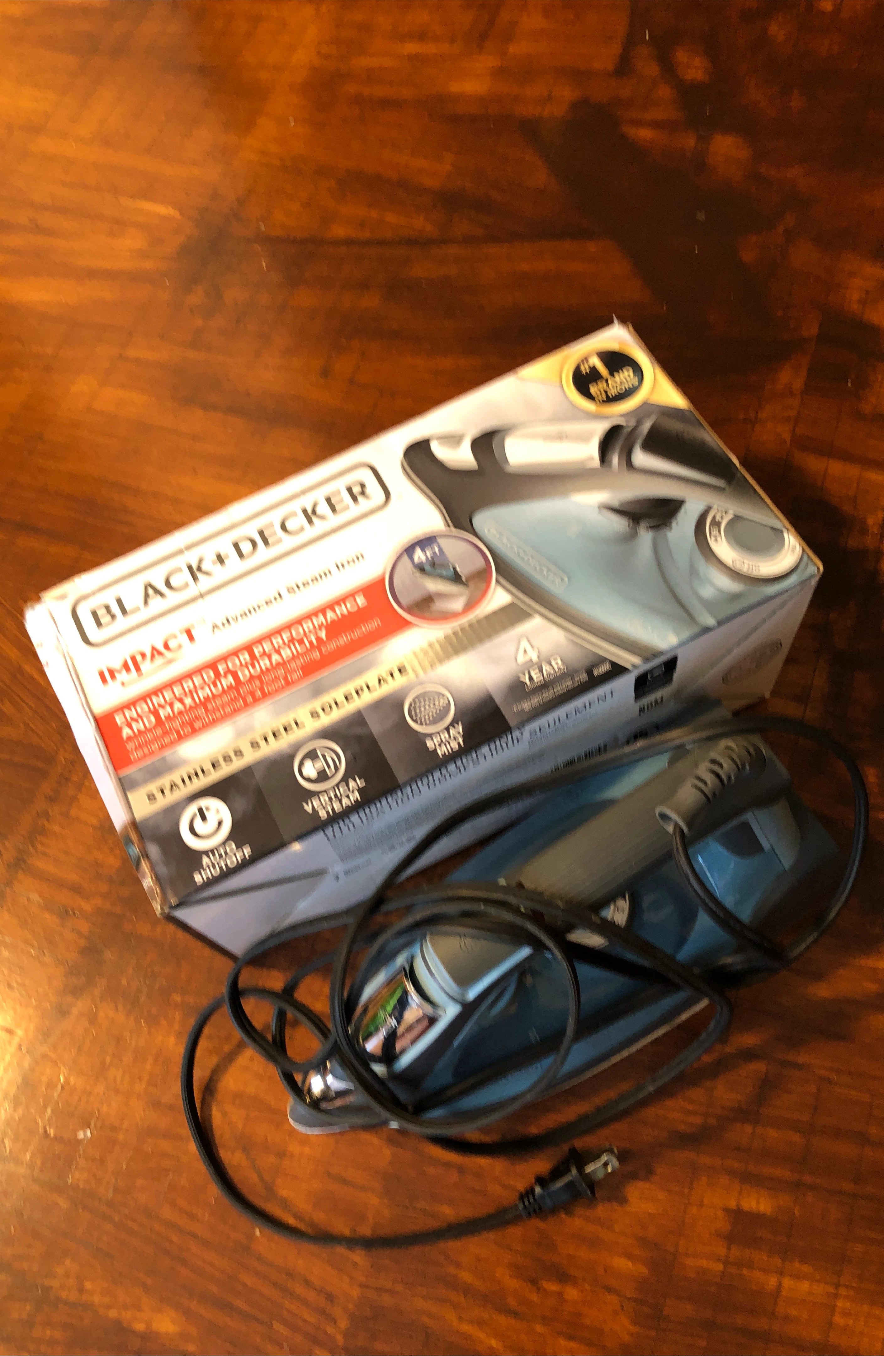 Selling a Black+Decker Impact Advanced Steam Iron. It's engineered for performance and maximum durability with a stainless steel soleplate. It also features vertical steam and auto shutoff. Comes with a 4-year limited warranty.