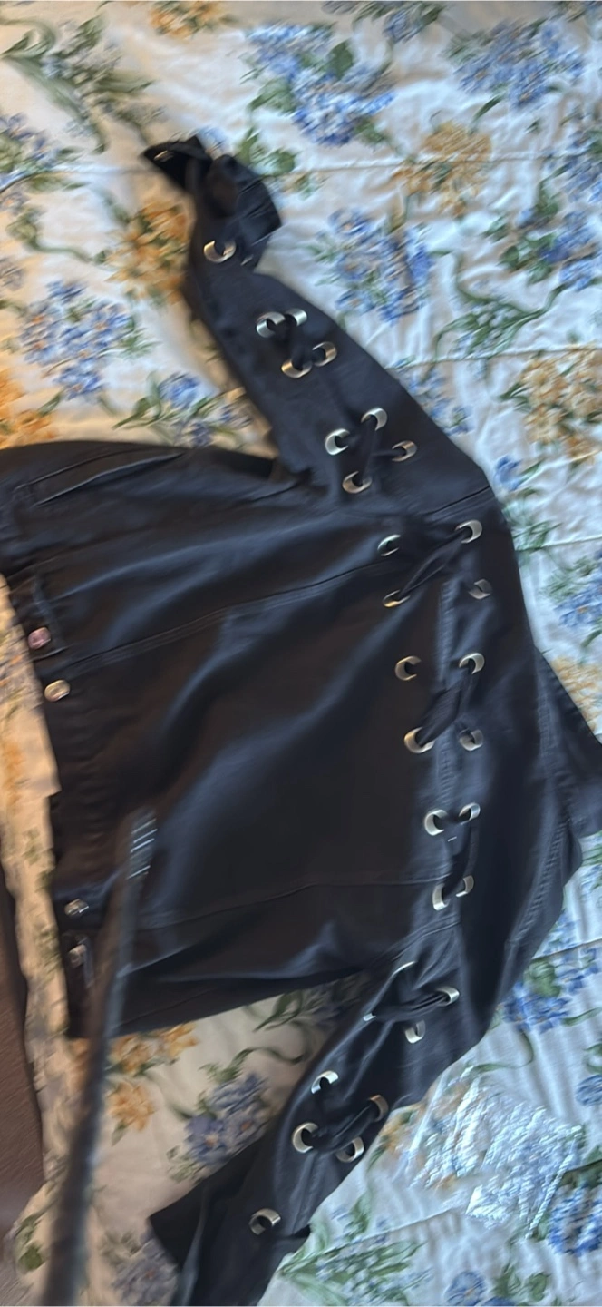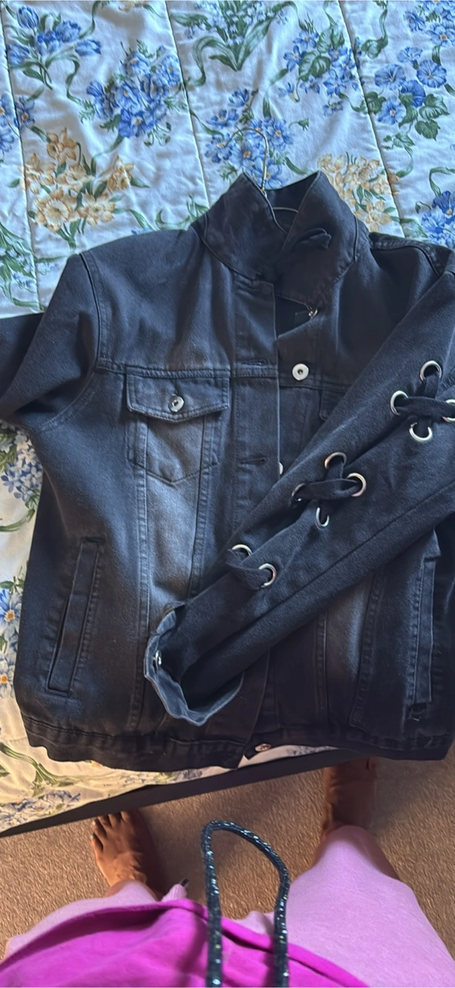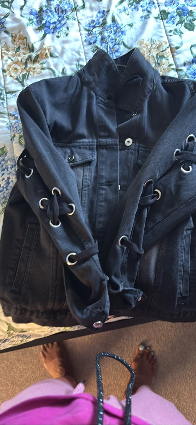 10Stylish black denim jacket. Button-up closure. Features eyelet details on the sleeves. Such a piece would be perfect to wear during a leisurely stroll.