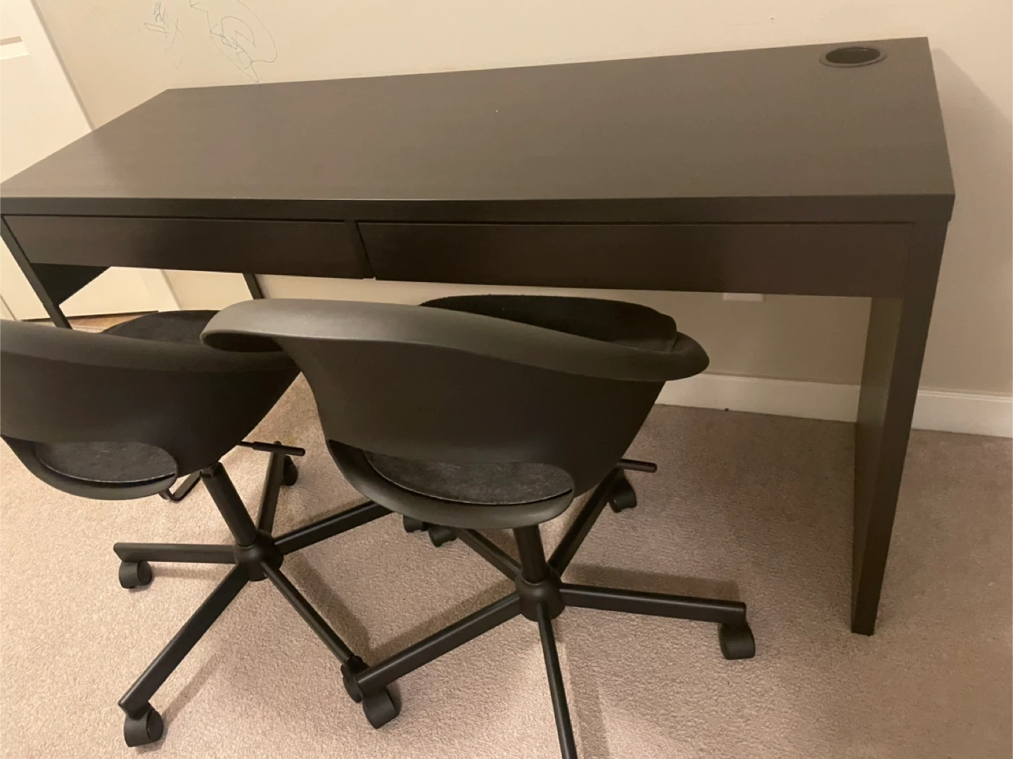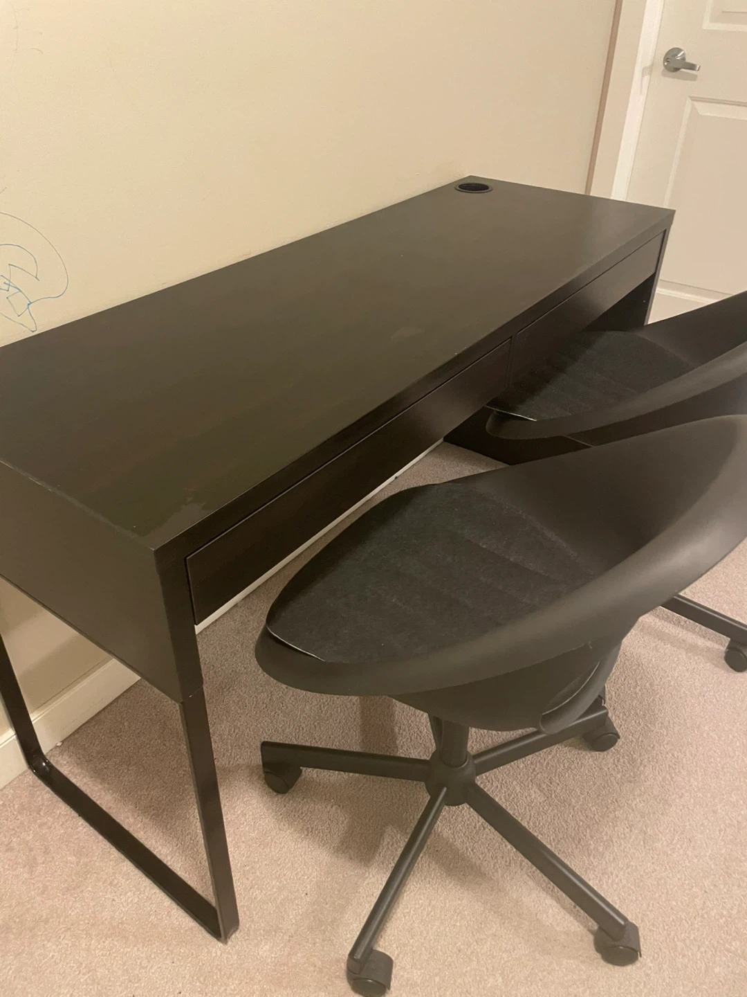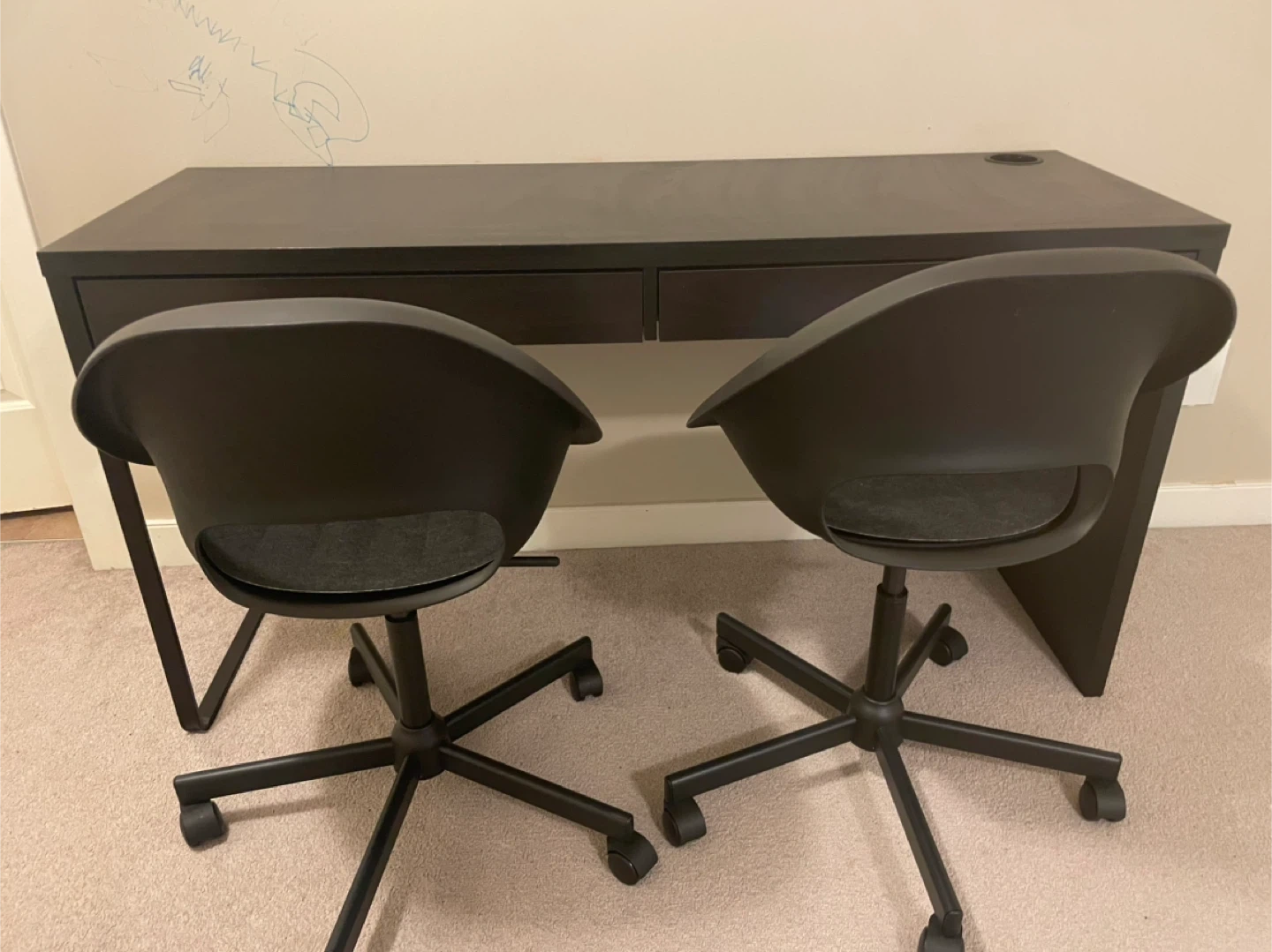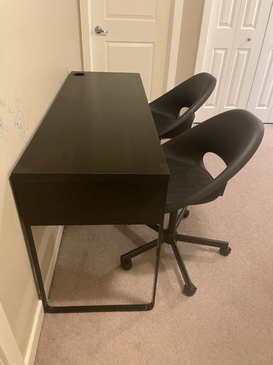 Selling a black desk and office chair set. The desk has a sleek design with a hole for cable management. The chairs are comfortable and have a unique back design. Great for a home office or student setup!