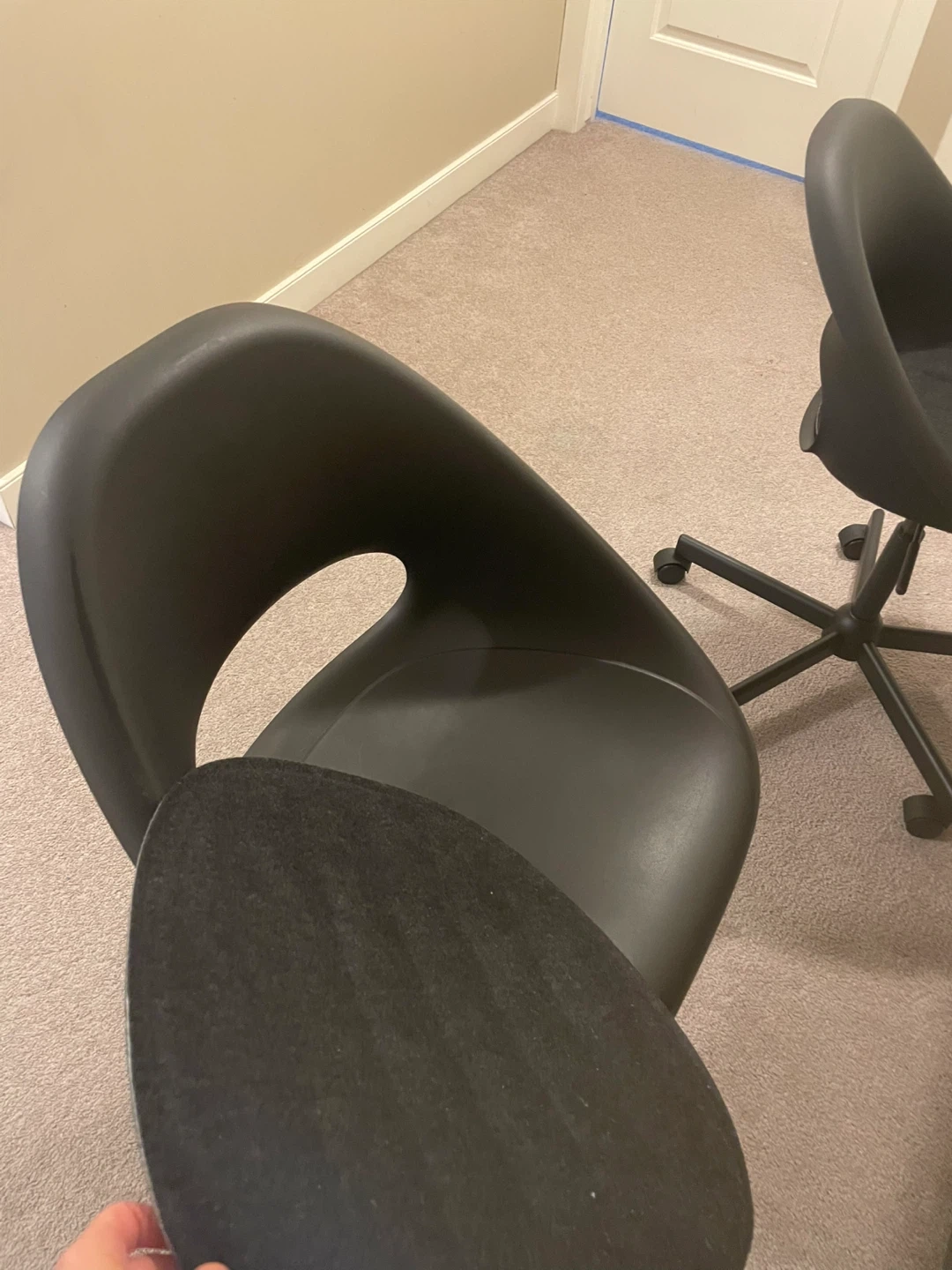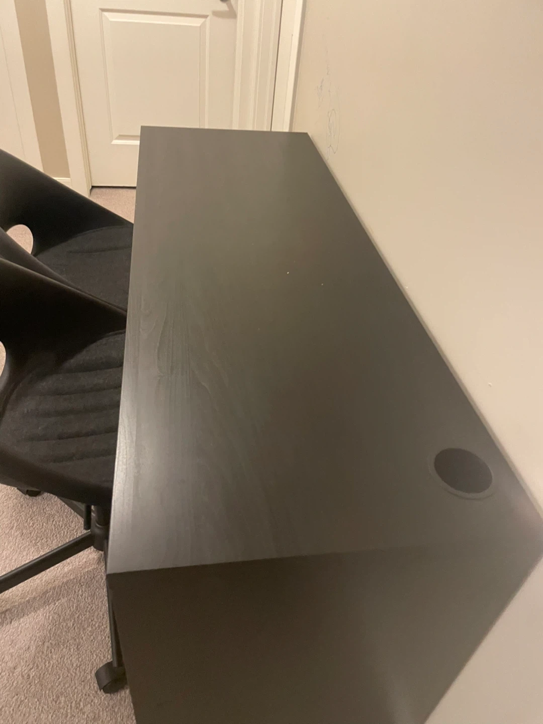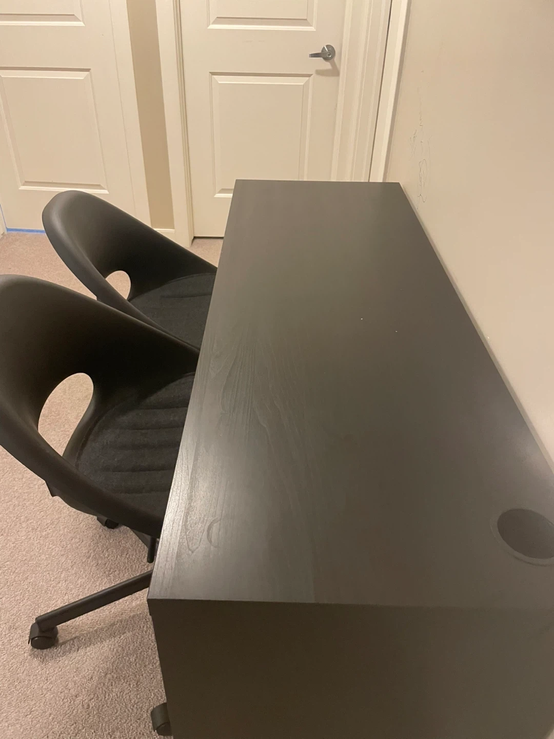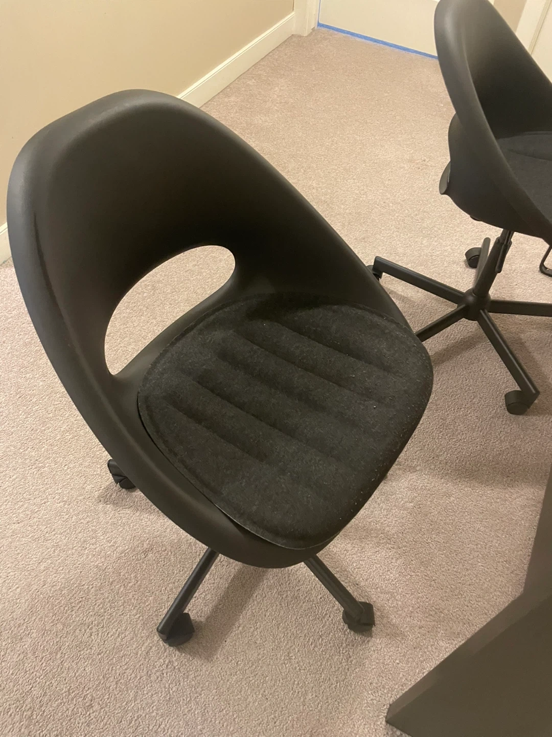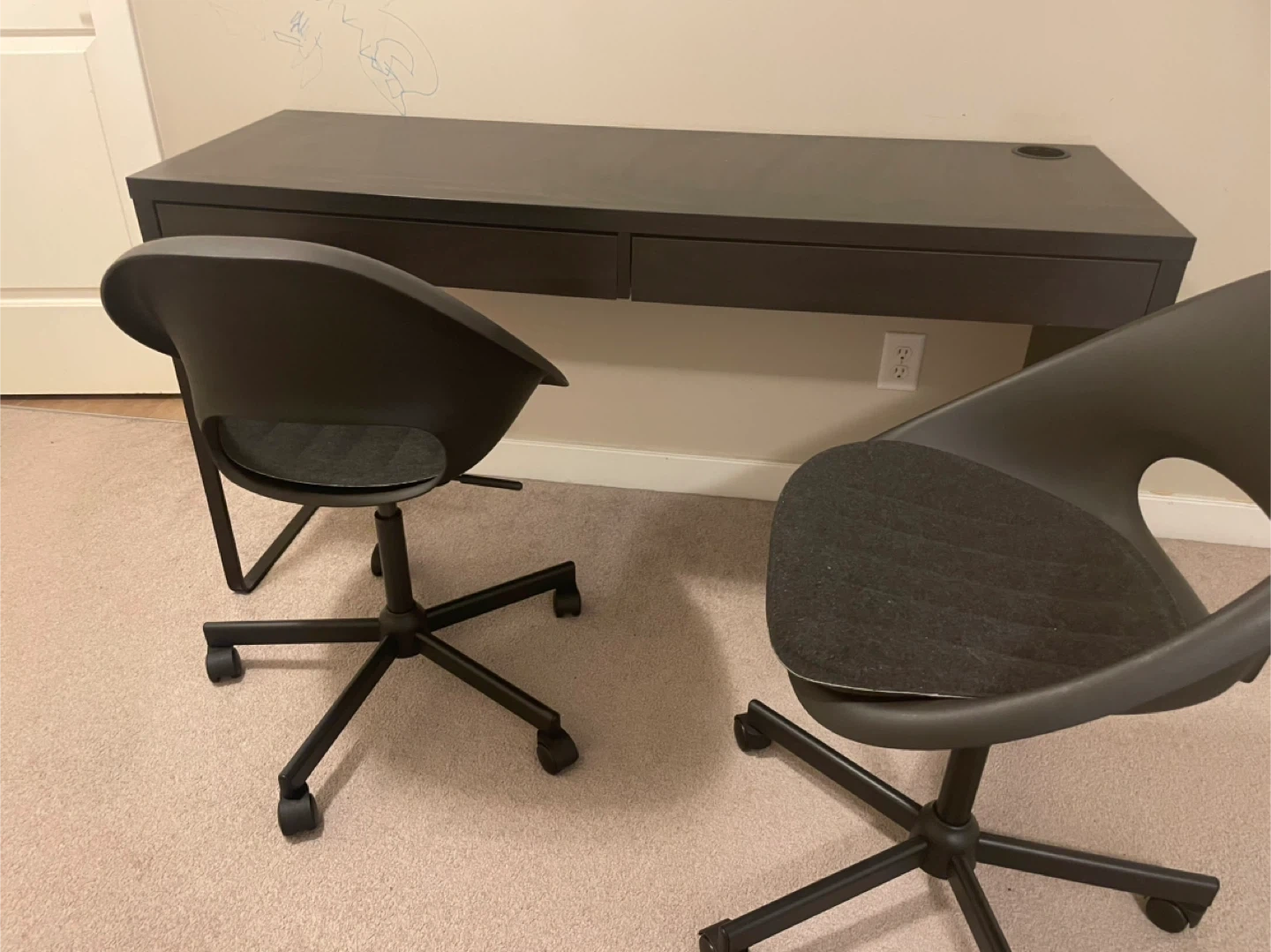 Selling a black desk and office chair set. The desk has a sleek design with a hole for cable management. The chairs are comfortable and have a unique back design. Great for a home office or student setup!