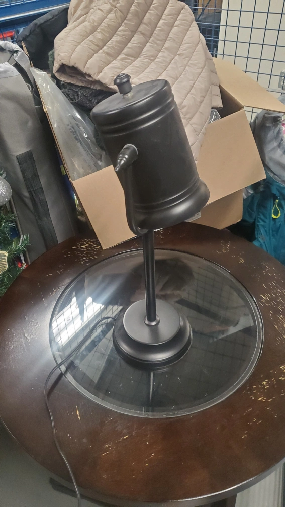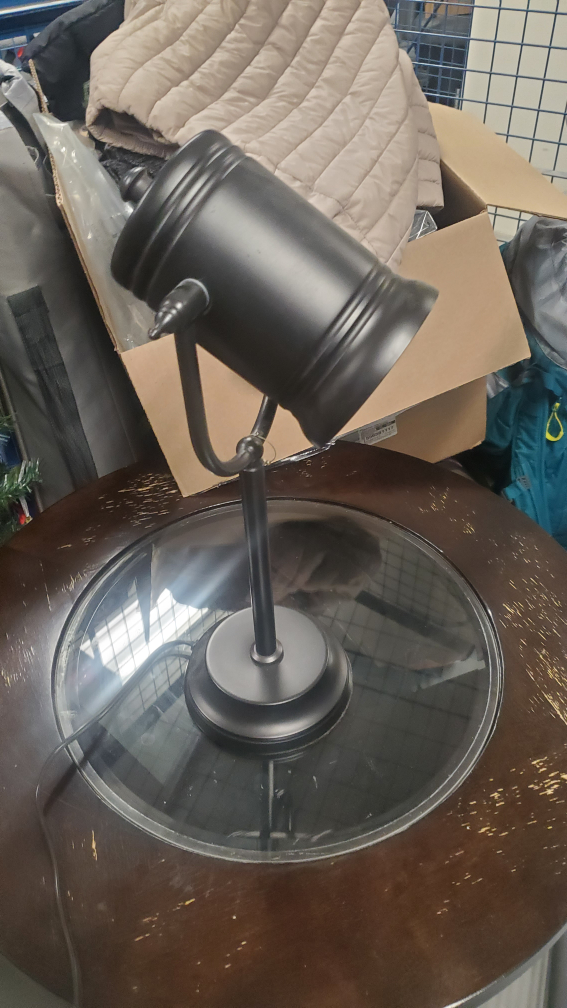 74A black desk lamp with a swiveling shade and a base that sits on a table. The lamp has a cord and a plug. pick up only