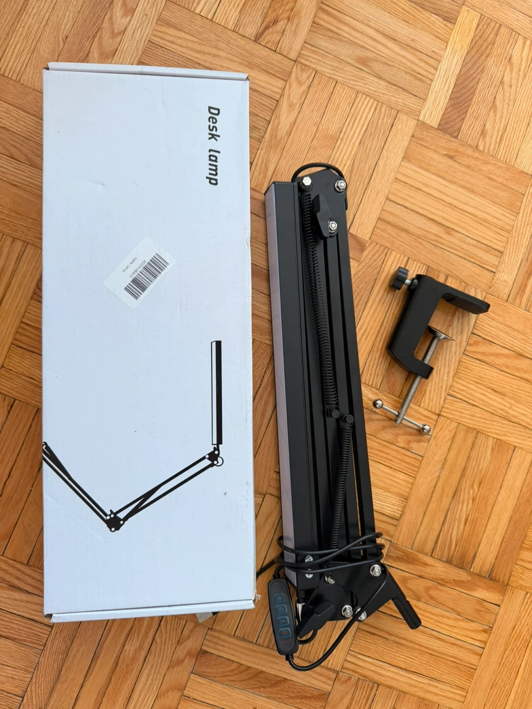 Selling a desk lamp with an adjustable arm! It's in great condition and comes with the original box. Perfect for a home office or study space, this lamp provides ample lighting while saving desk space. The adjustable arm allows you to direct the light exactly where you need it. It also includes all the components for easy setup