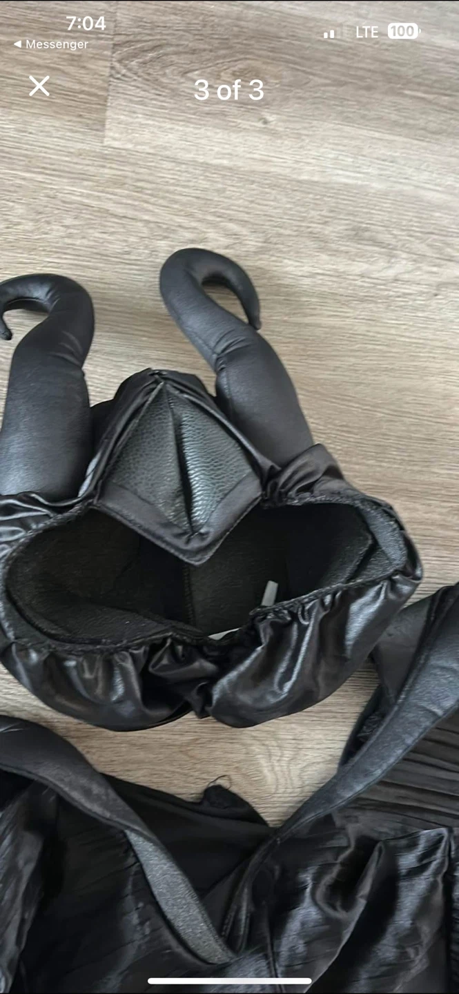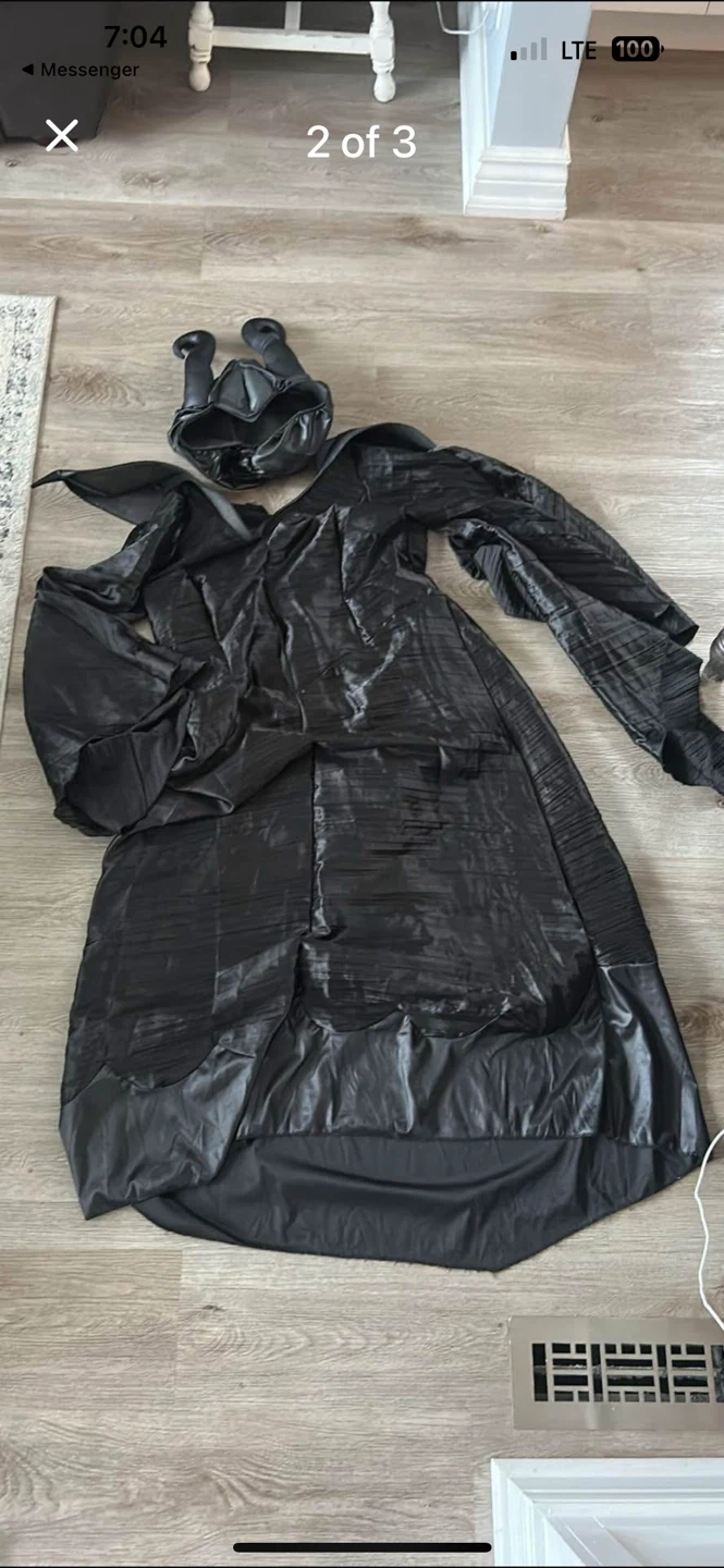 10Selling a black Maleficent costume. It includes the robe and headpiece with horns. Missing stone to dress. Size L/XL. Perfect for Halloween or costume parties!