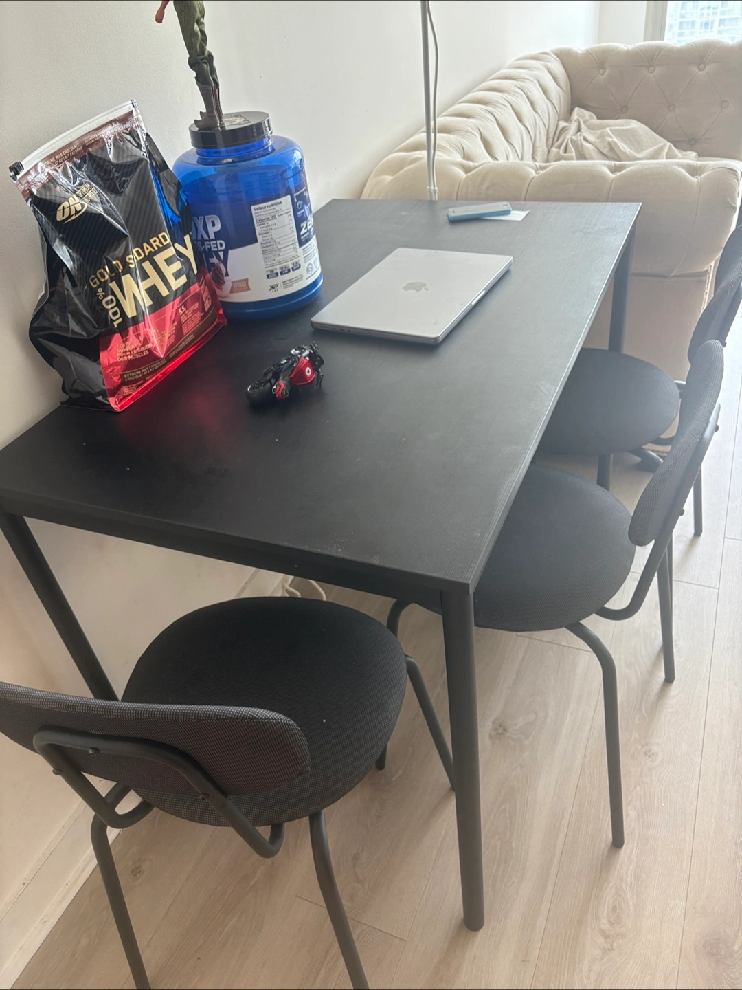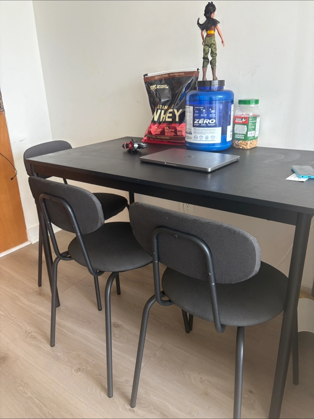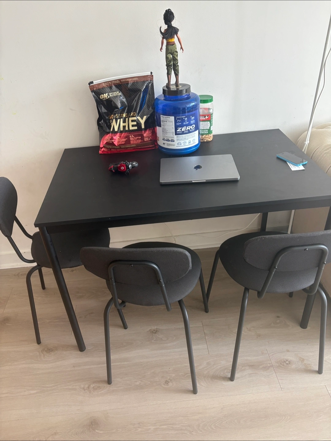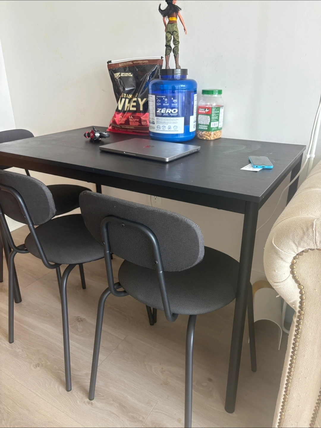 48Selling a dining table with three chairs. The set is in good condition and would be perfect for a small dining area or kitchen. The table is black, and the chairs are a matching grey colour. only 1 month old and in excellent condition. barely used, perfect for any home.