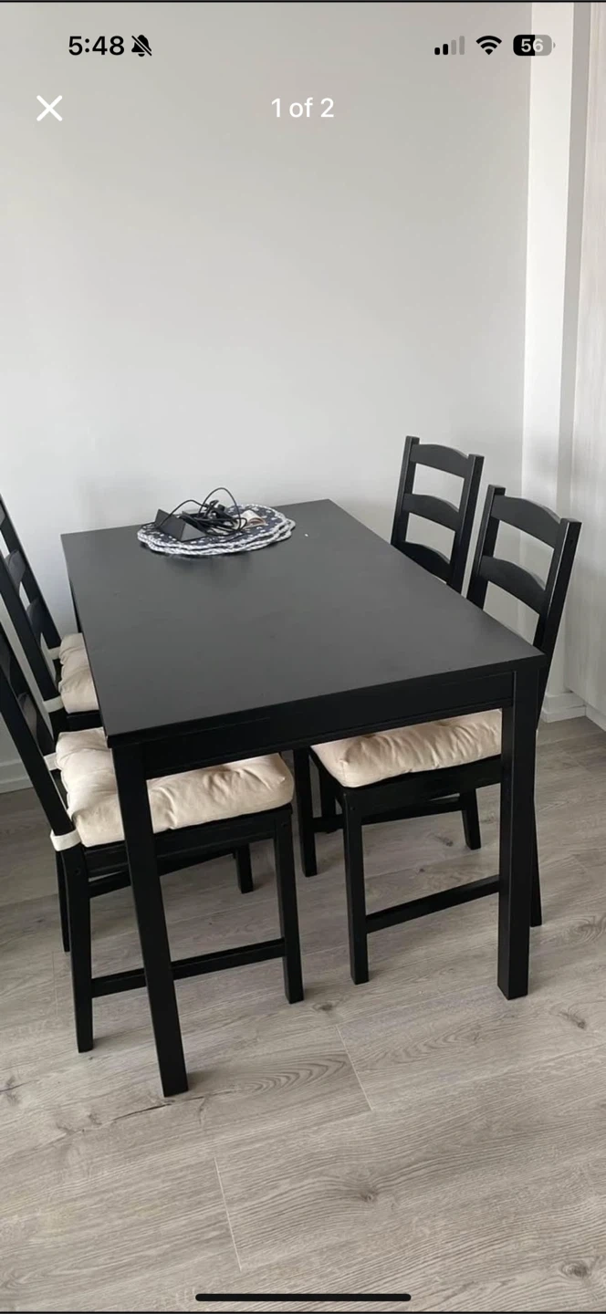 Selling a black dining table along with four chairs. The set is in good condition and ready for a new home. Perfect for a small dining area or kitchen!