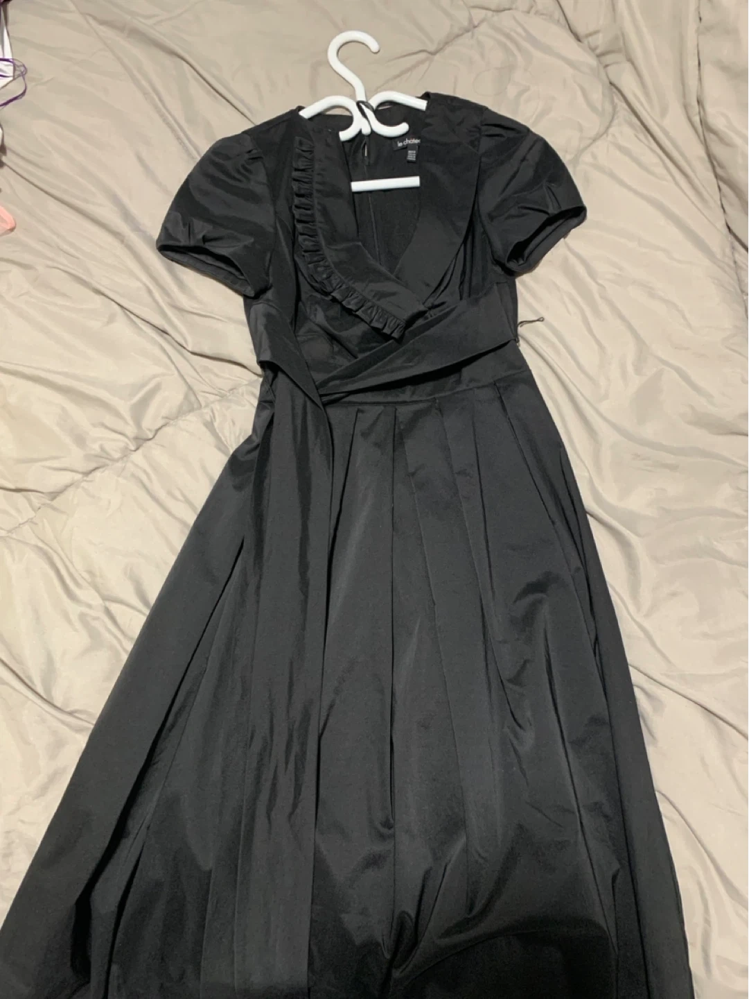 65Here's a lovely black dress. It features a flattering silhouette and is perfect for any occasion. It's in great condition! Has a ruffle on the V-neck and small puffy sleeves, can be tied with a big ribbon on the back.