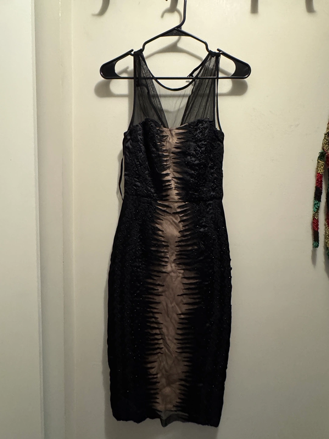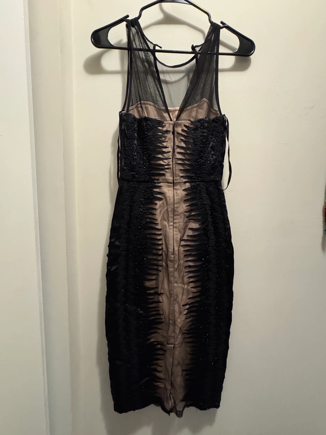 A stylish black dress featuring unique embellishments. The dress has a mesh neckline and decorative detailing throughout. It appears to be in good condition and ready for a new home!