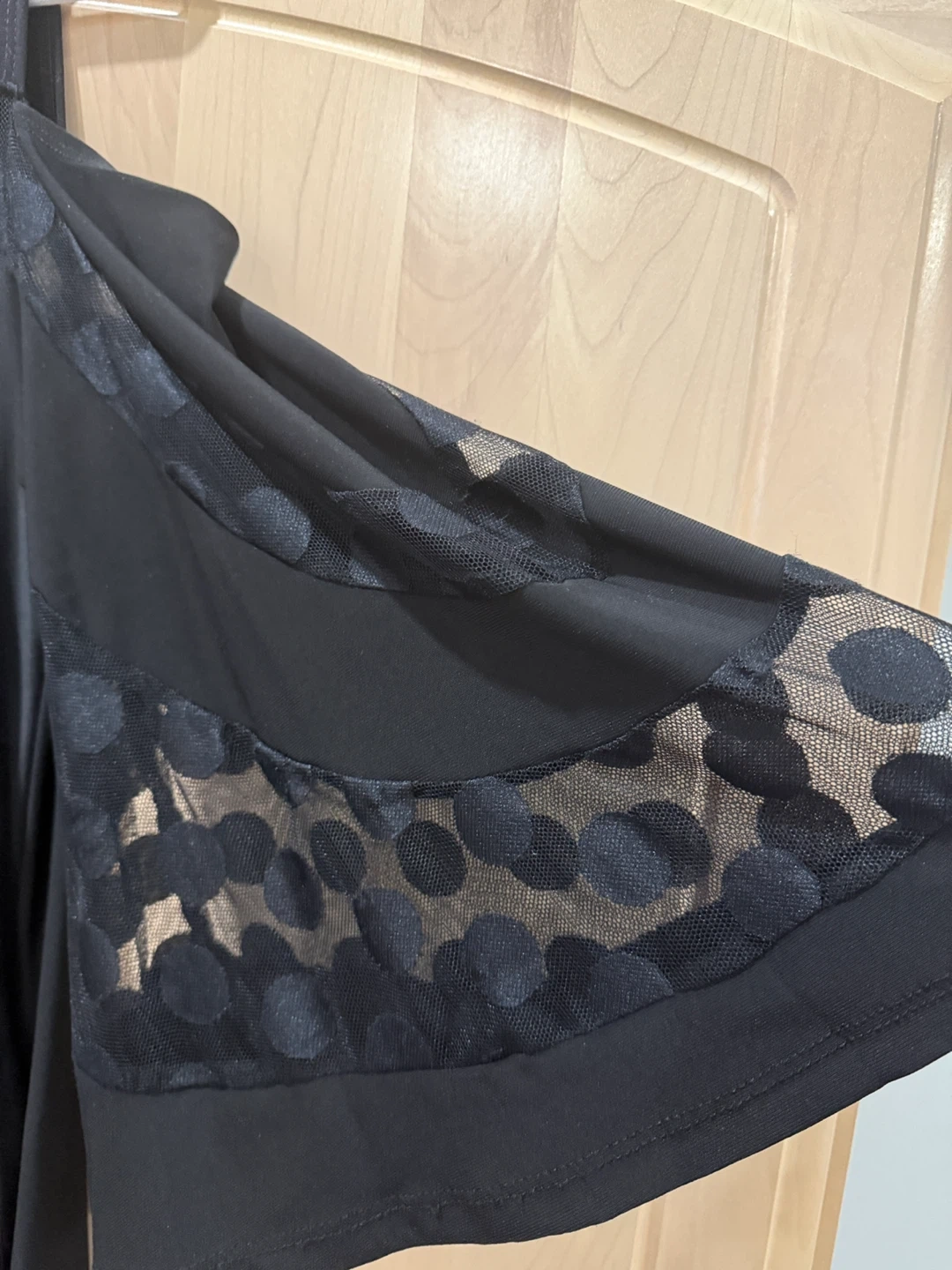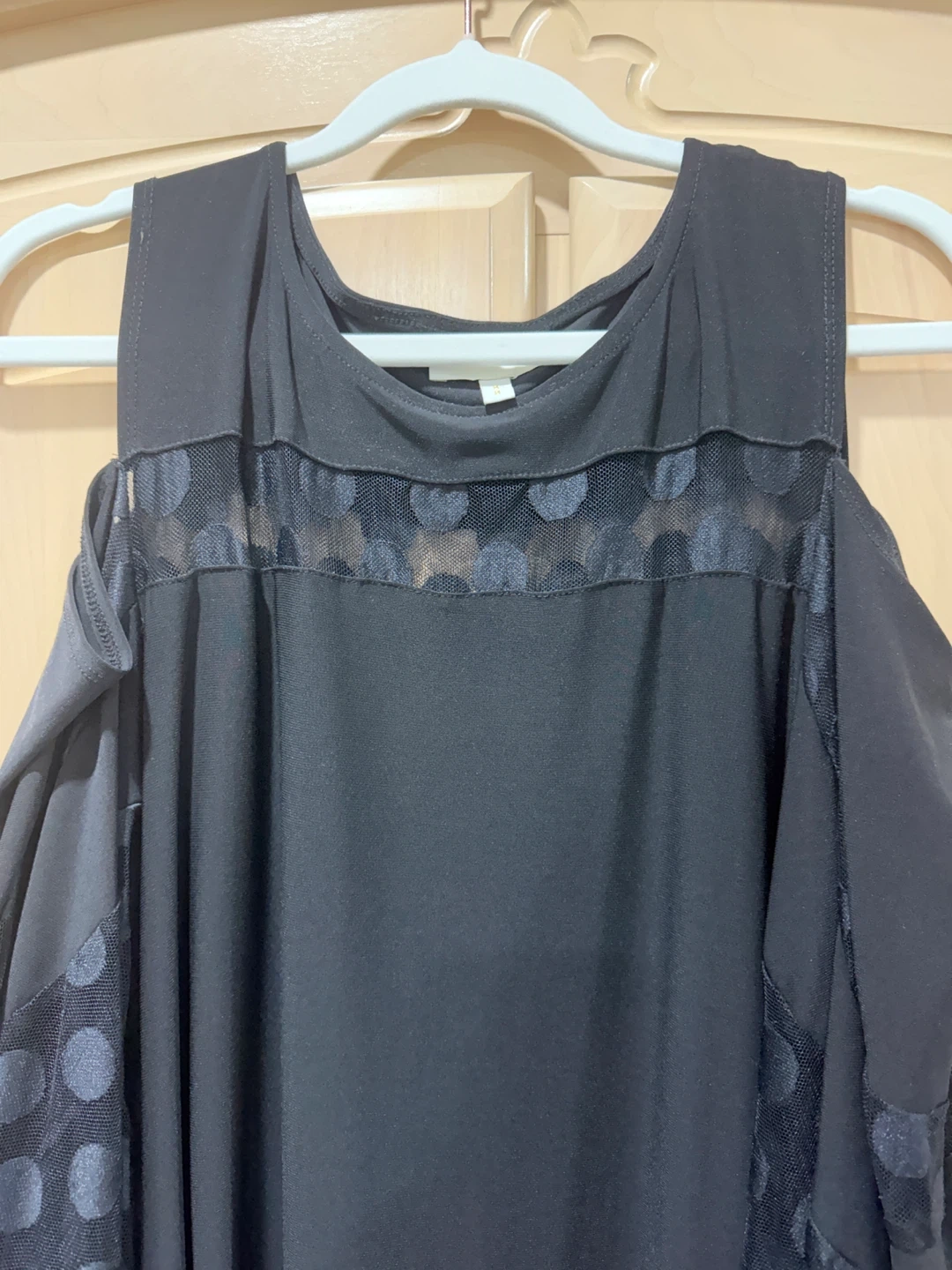 1000+This is a cute black dress with some unique details! It features polka dot mesh accents on the sleeves and across the chest area. It's in excellent condition and ready for a new home