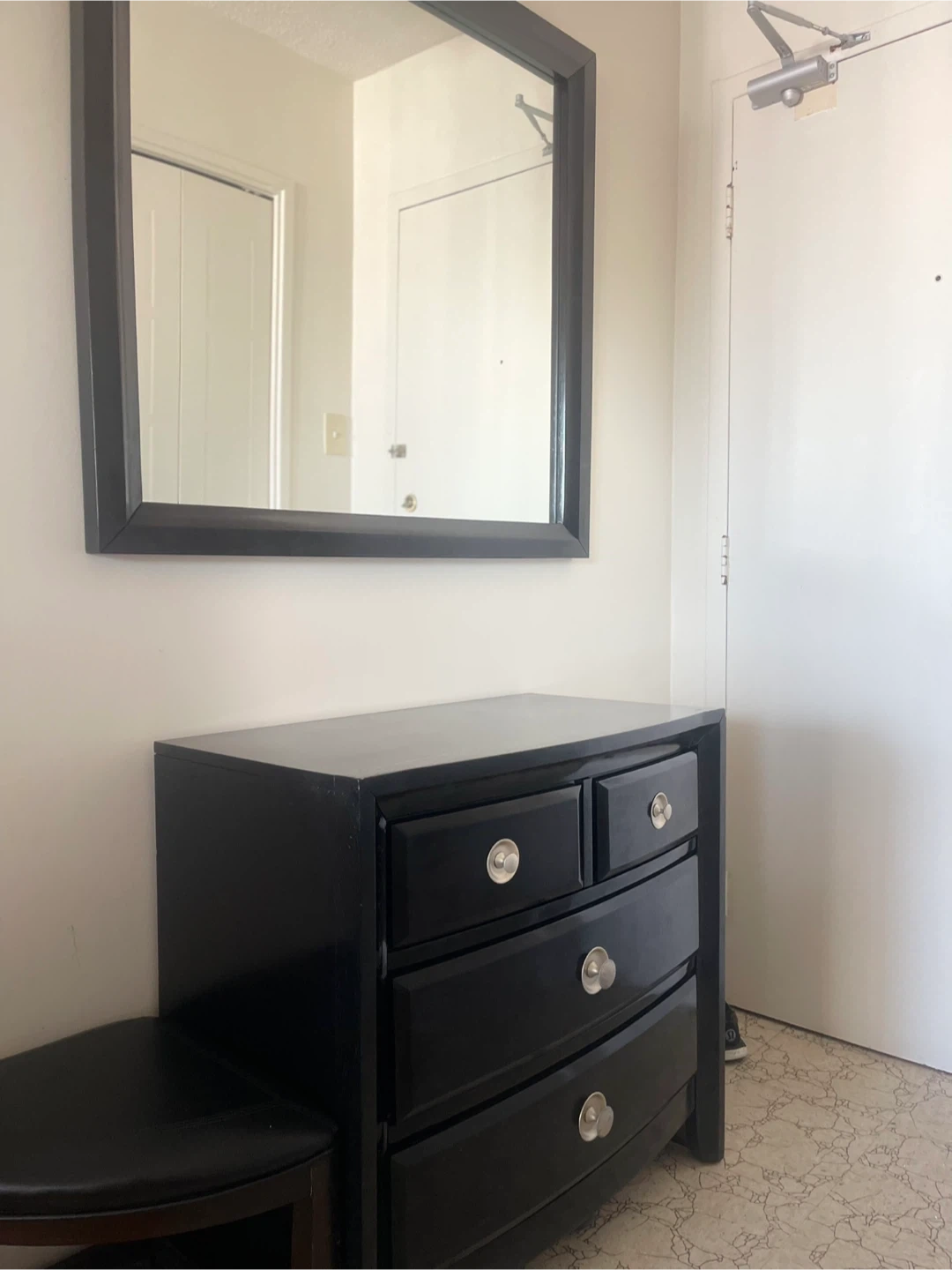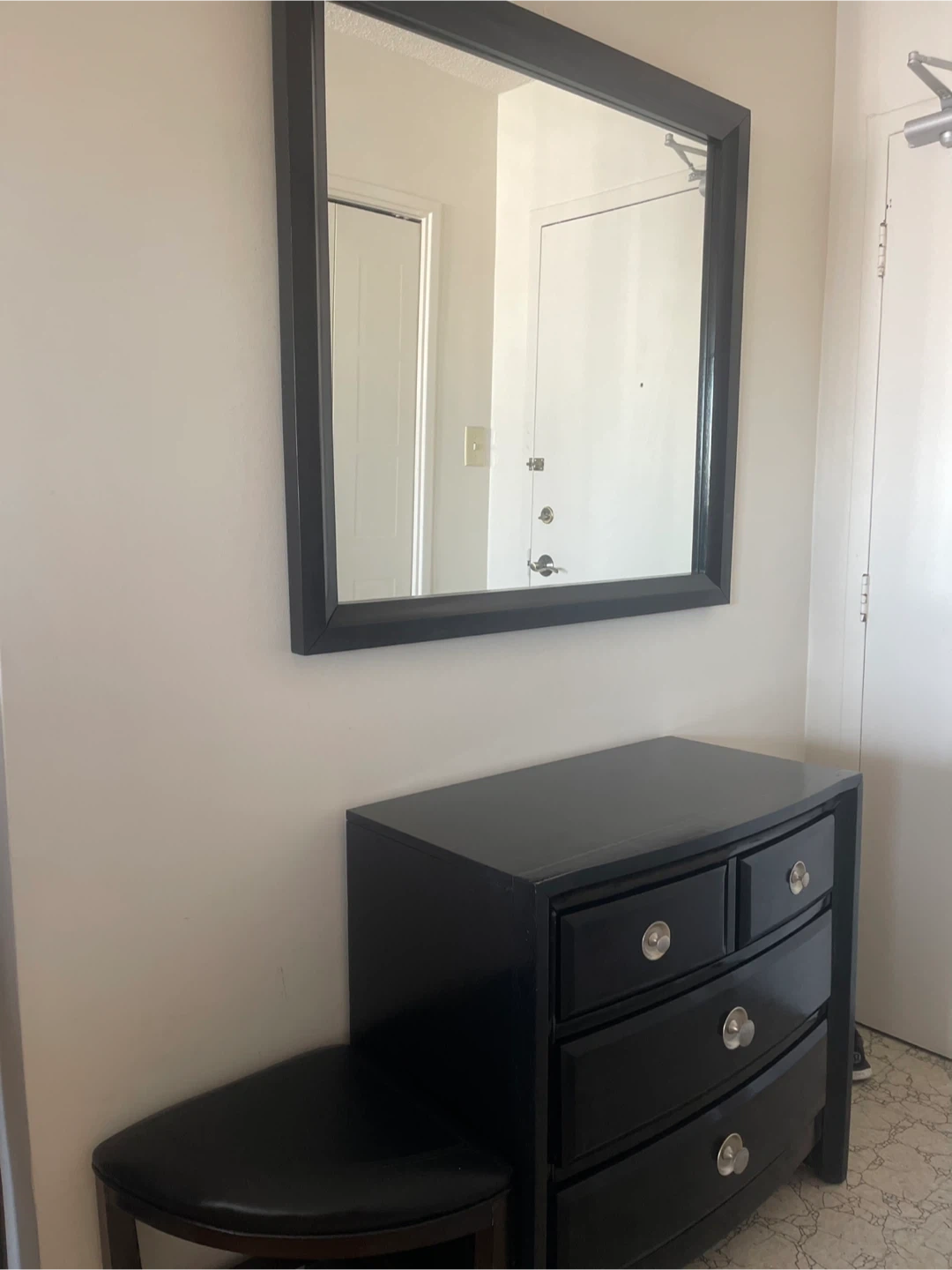 Selling a sleek black dresser with a matching mirror! It's in great shape and would look fantastic in any room. The dresser has multiple drawers for ample storage, and the mirror adds a touch of elegance