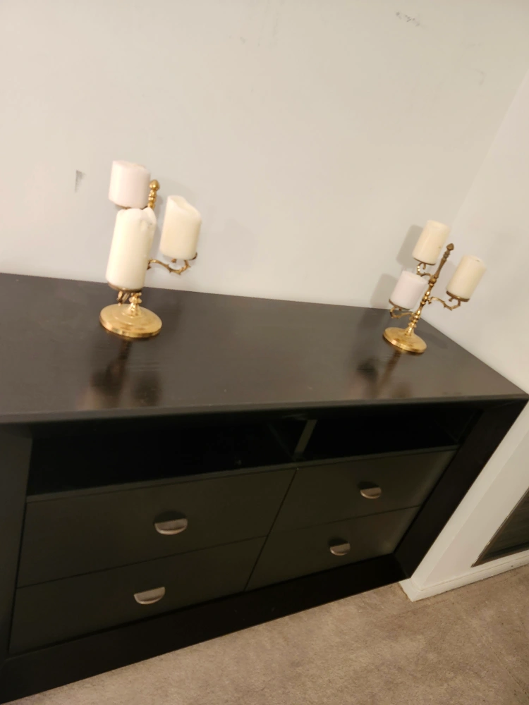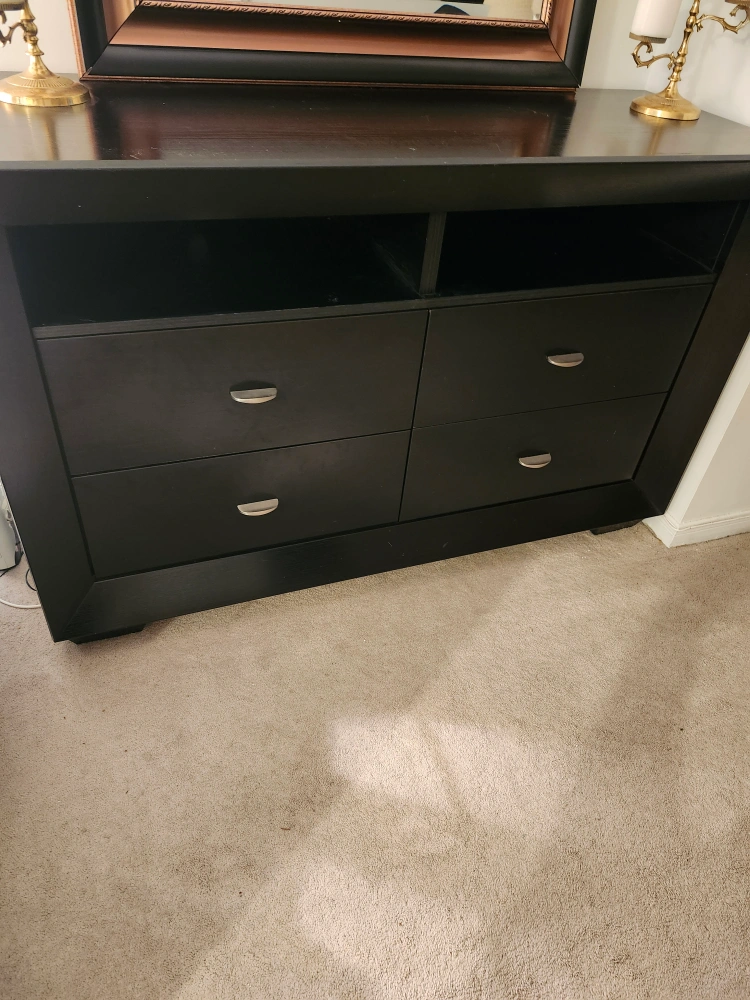 Selling a black dresser or console. It features four drawers and two open shelves on the middle. moving Sale Perfect for adding storage and style to any hallways, or bedrooms. W52"× D 20"× H 33" I have bought it from Ashley. Moving Sale Yonge & Sheppard