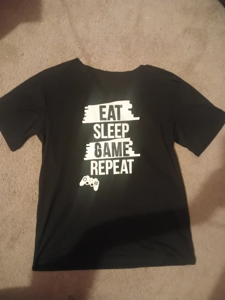18Selling a black T-shirt with the design 'Eat Sleep Game Repeat' on the front. It's in great condition and perfect for any gamer! Collar is cut off.