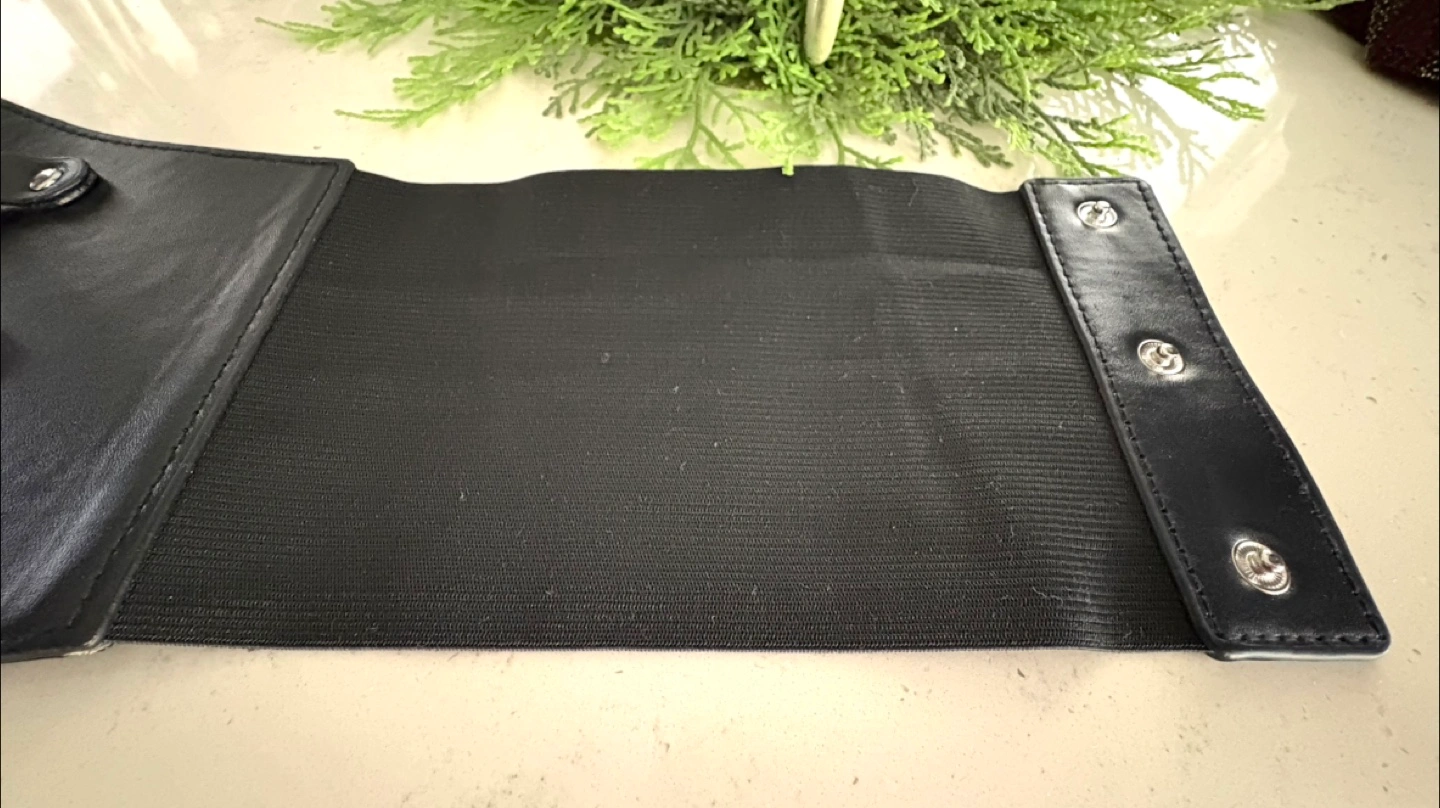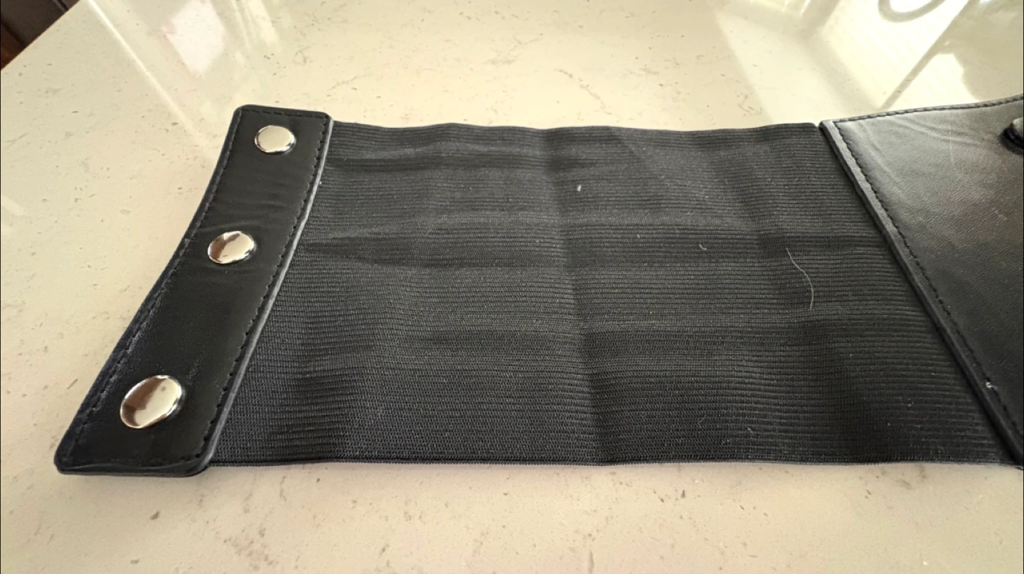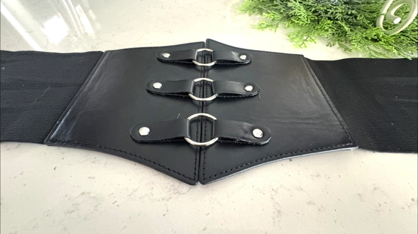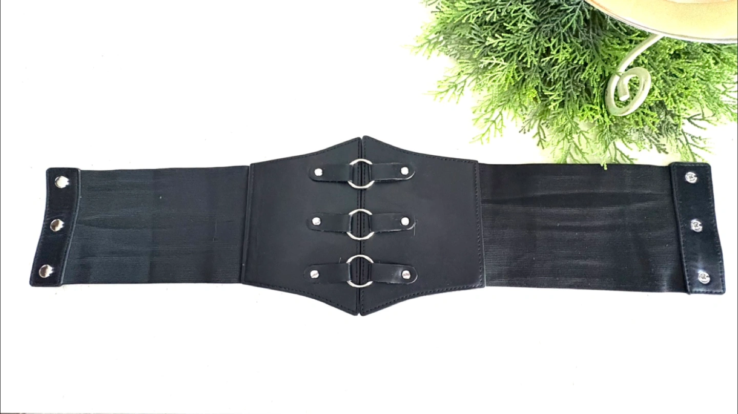 60Here's a stylish black elastic corset belt! It features a unique design with three decorative rings in the front. This belt is perfect for adding a touch of elegance to any outfit and cinching in your waist for a flattering silhouette. 25” long Can stretch to 31” long 5” wide