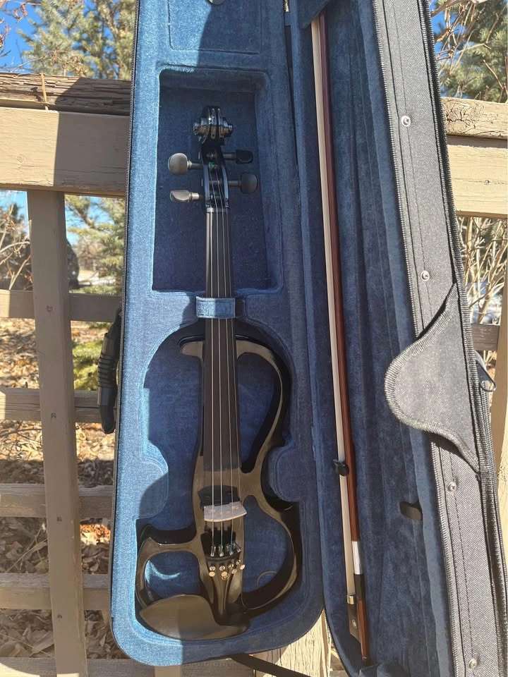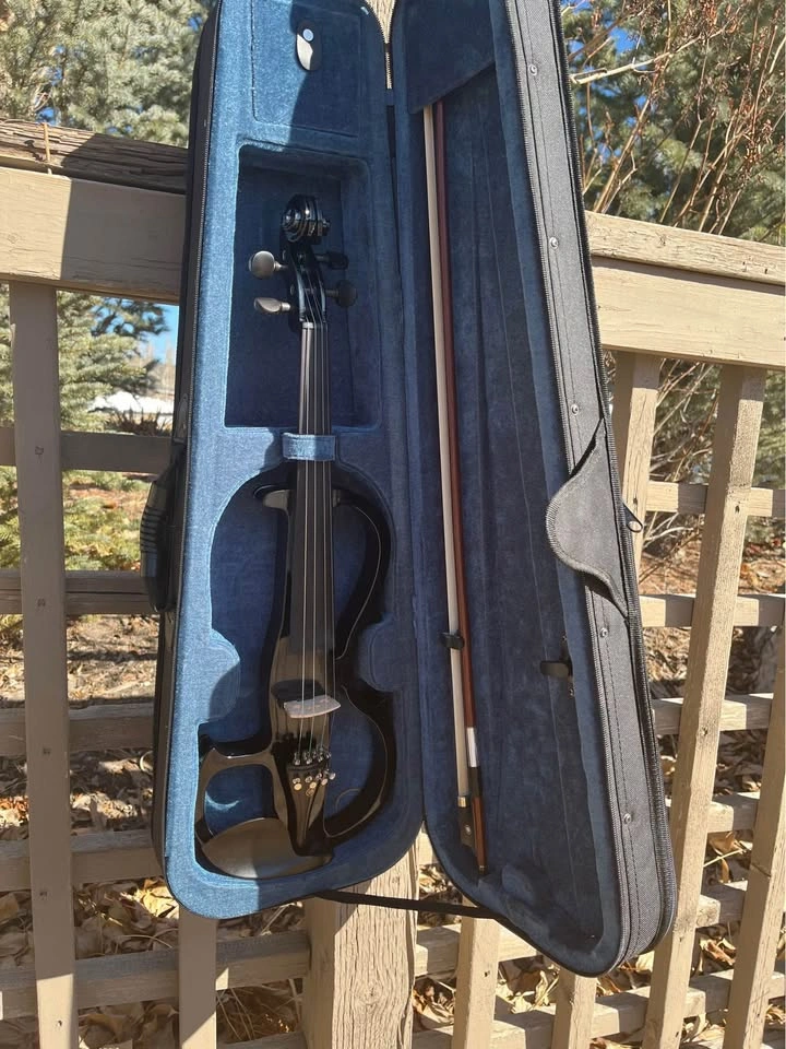 Looking for a sleek, modern electric violin? This stunning black electric violin is perfect for beginners and experienced players alike! Features: Stylish, lightweight body with a glossy black finish Four strings with fine tuners for easy tuning adjustments Comfortable ebony-like fingerboard and pegs Includes a matching bow and a sturdy, padded case for protection Built-in output for easy connection to an amplifier or headphones (great for silent practice!) This violin is in excellent condition, barely used, and ready to play! Perfect for musicians looking to explore electric violin sounds for performances, recording, or silent practice.