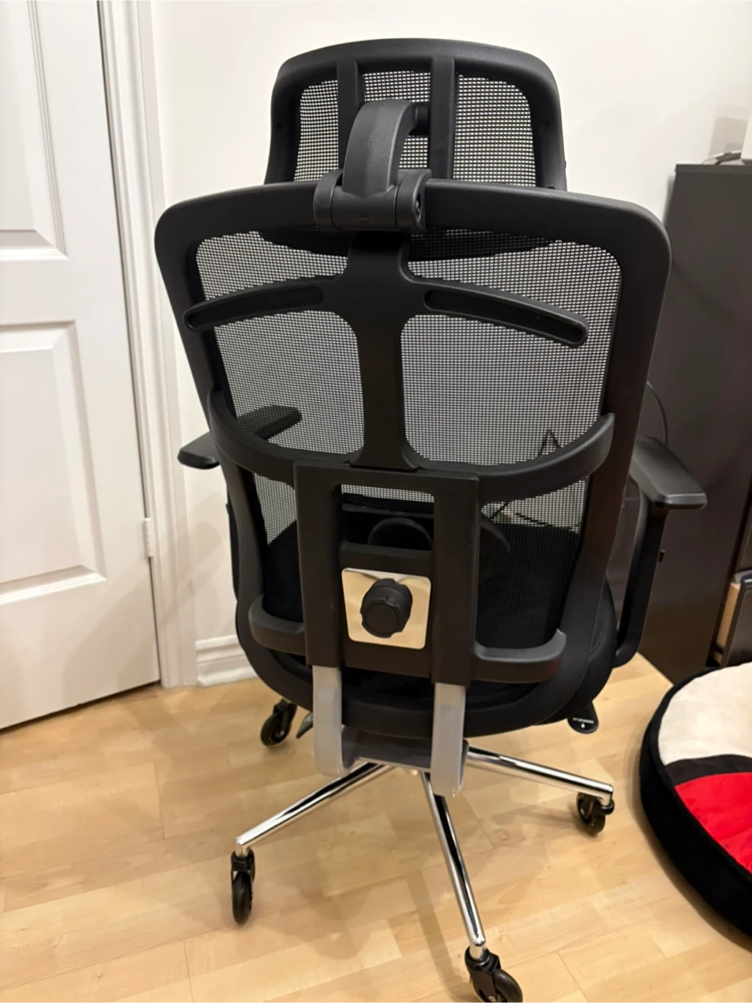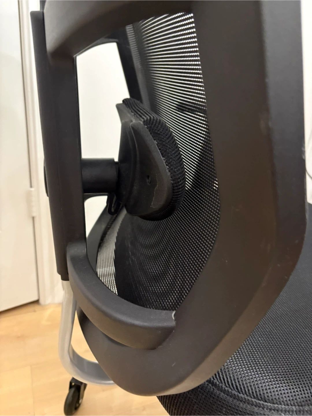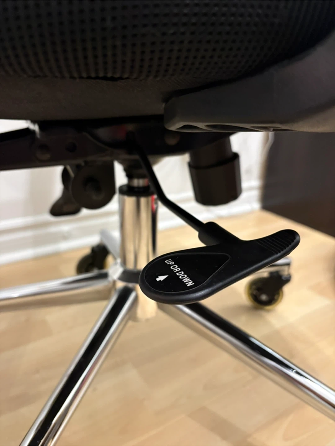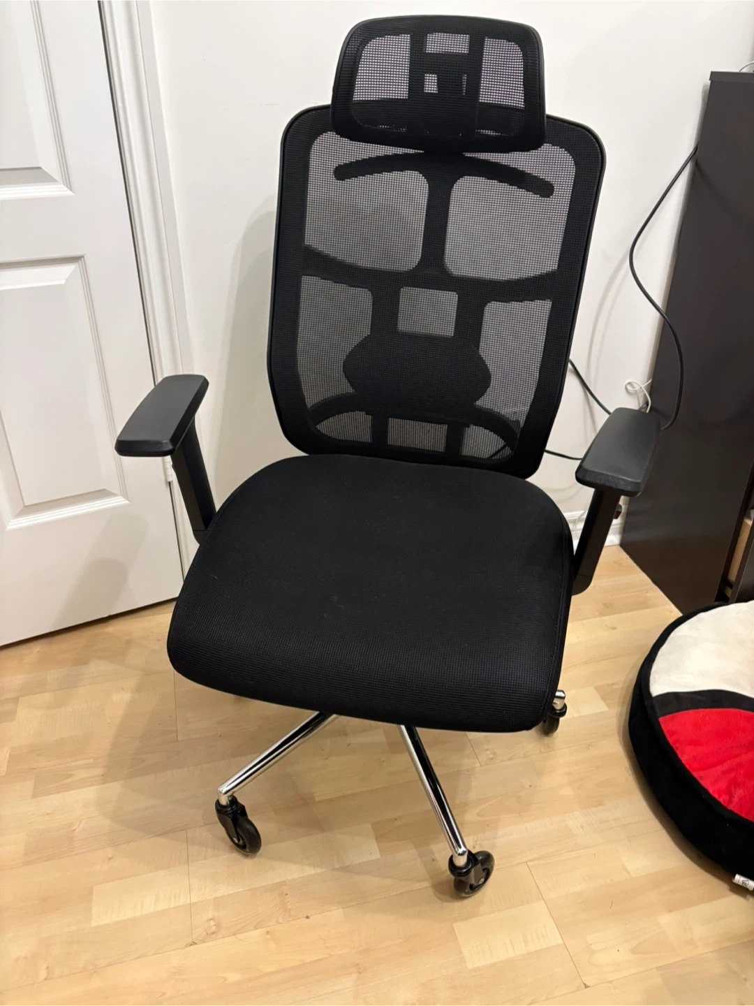 303Black ergonomic adjustable office chair. It has a mesh back and adjustable lumbar support, headrest and armrests. I changed the wheels to rollerblade wheels, so it moves very smoothly. Pick up only at Yonge and York Mills.