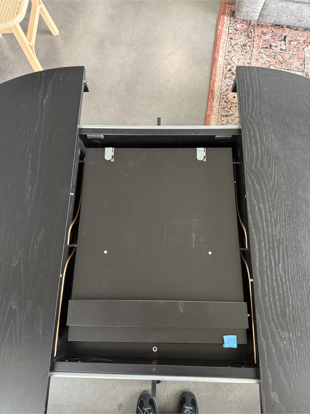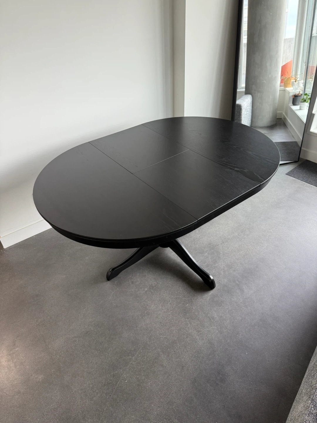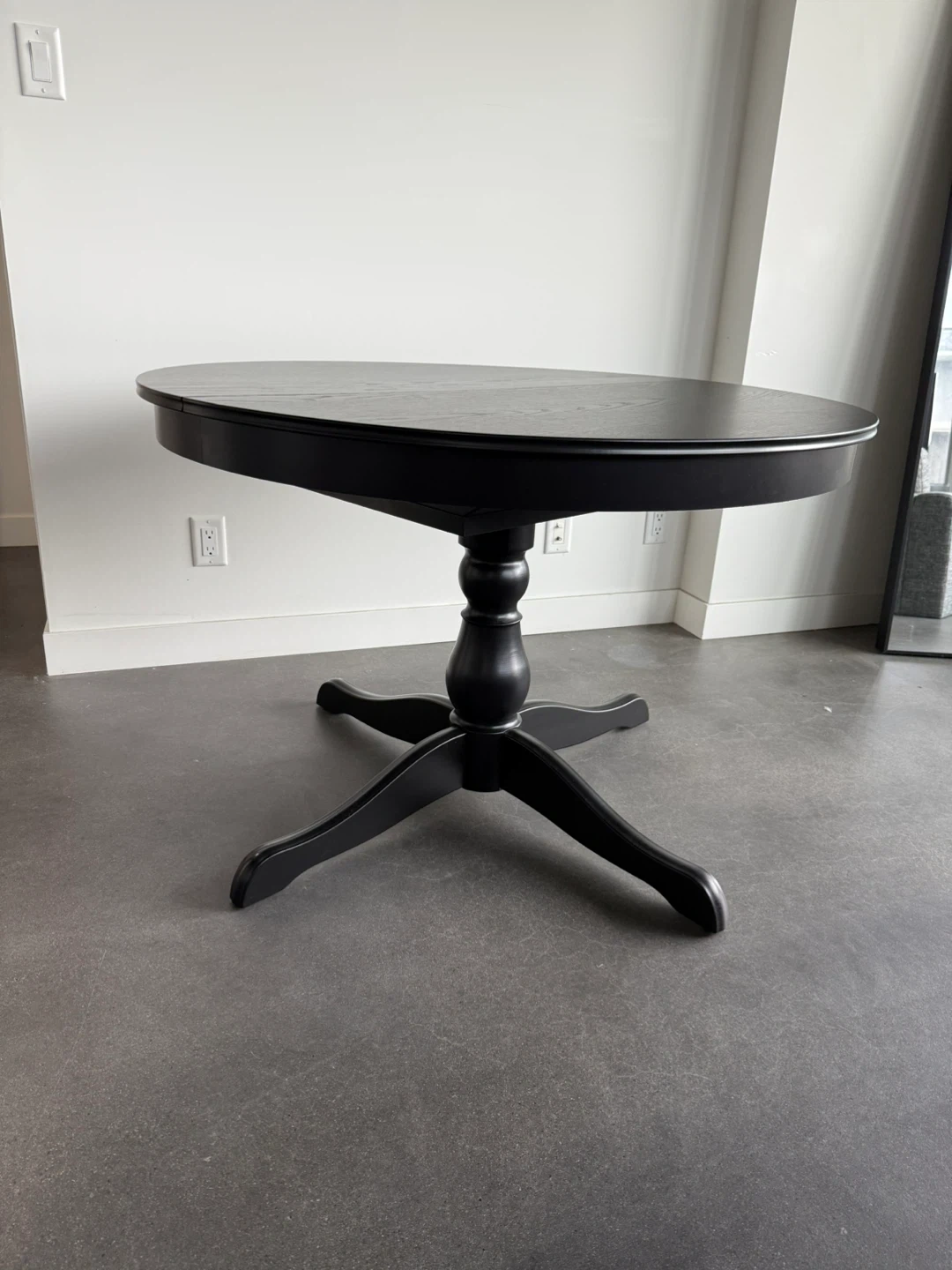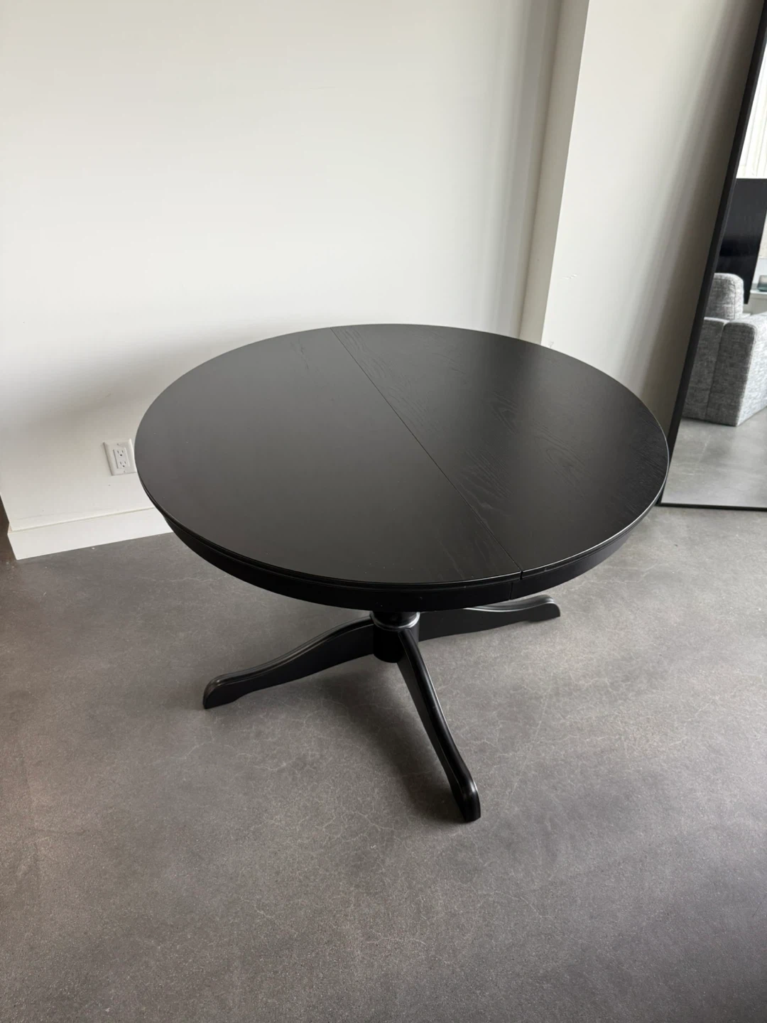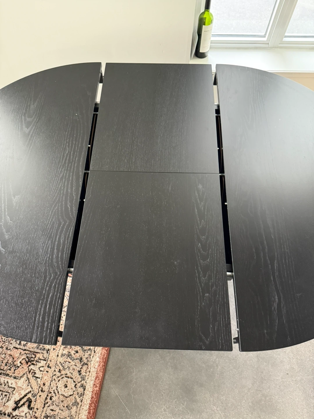 60Selling a black extendable round dining table. It is in good condition and perfect for smaller spaces that need the flexibility of a larger table. The table has an extension leaf that stores underneath the tabletop when not in use. * Material: Oak veneer * Colour: Dark brown * Width: - Min: 43 1/4” - Max: 61” * Height: 16 7/8”