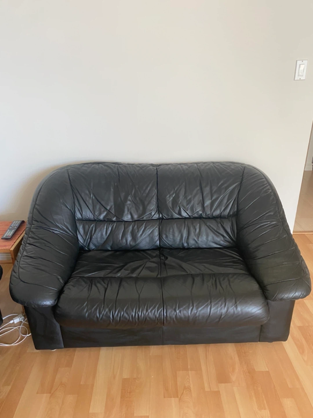 520Gently used black fake leather loveseat. It's in good condition and would be a great addition to any living room or den! Size: 4.8 x 3 feet To be picked up between October 26-28