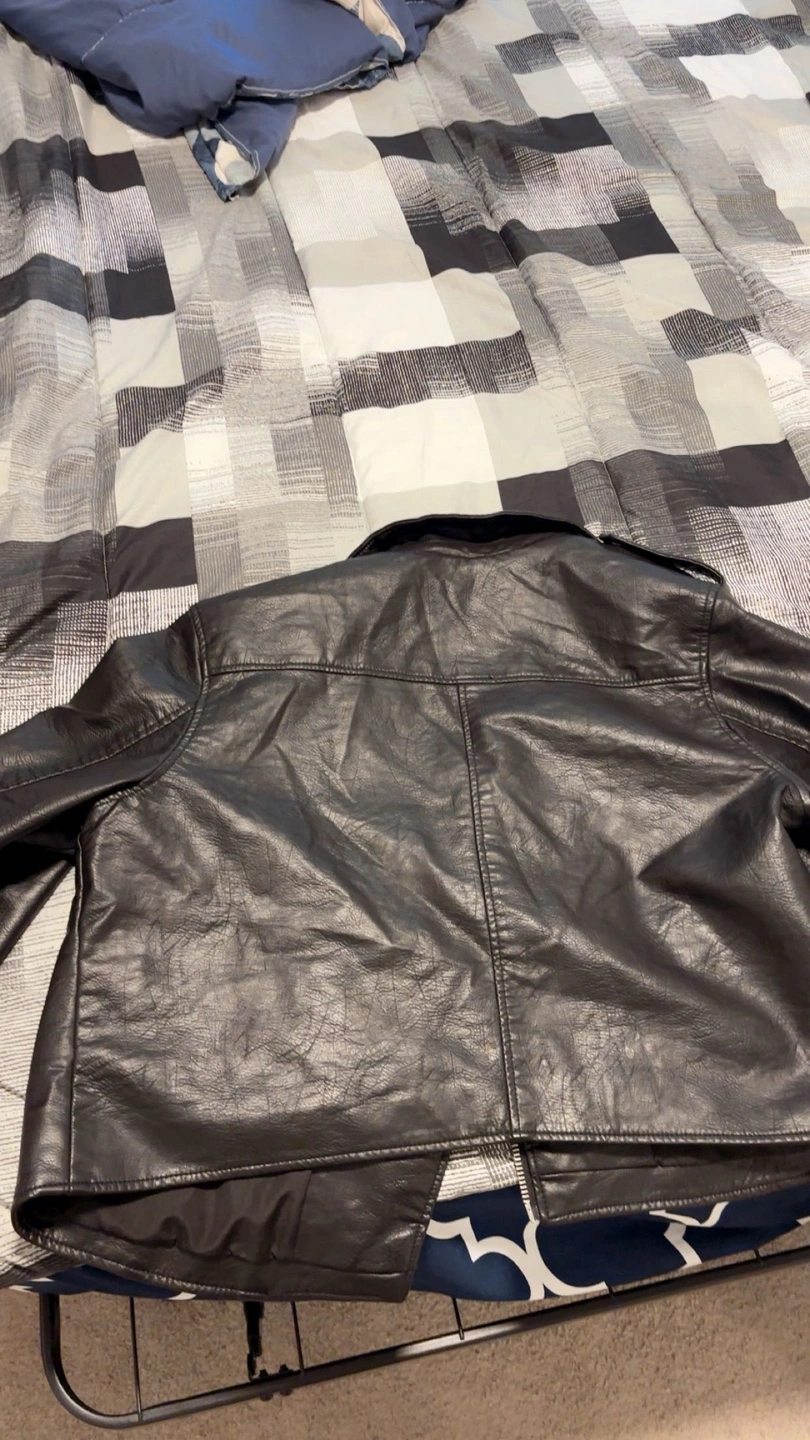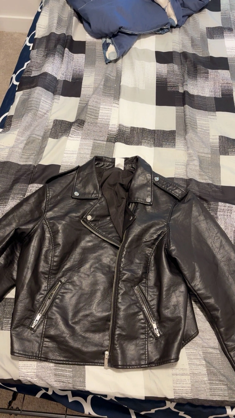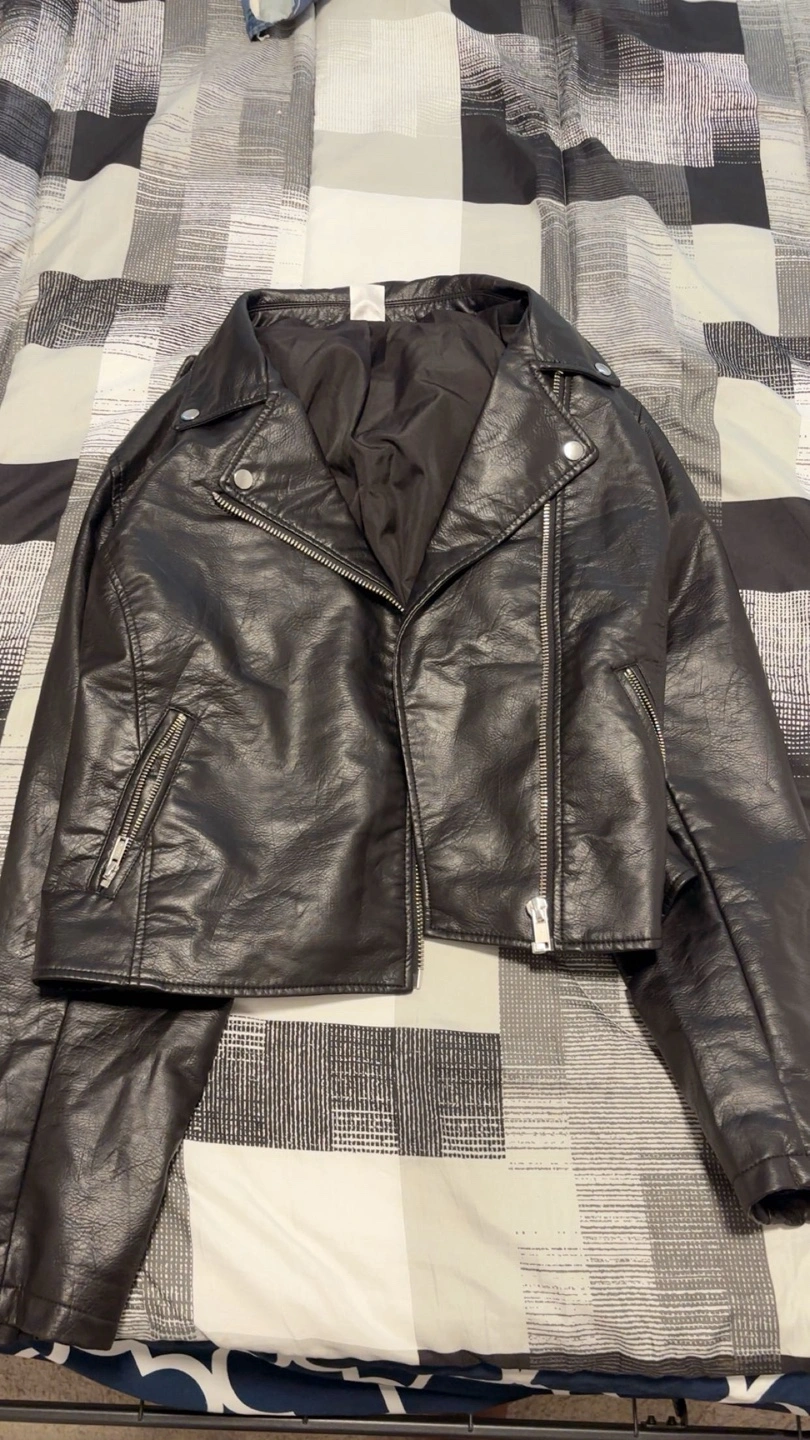 Selling a black faux leather jacket. It's in good condition and would make a great addition to your wardrobe! Perfect for layering during the cooler months.