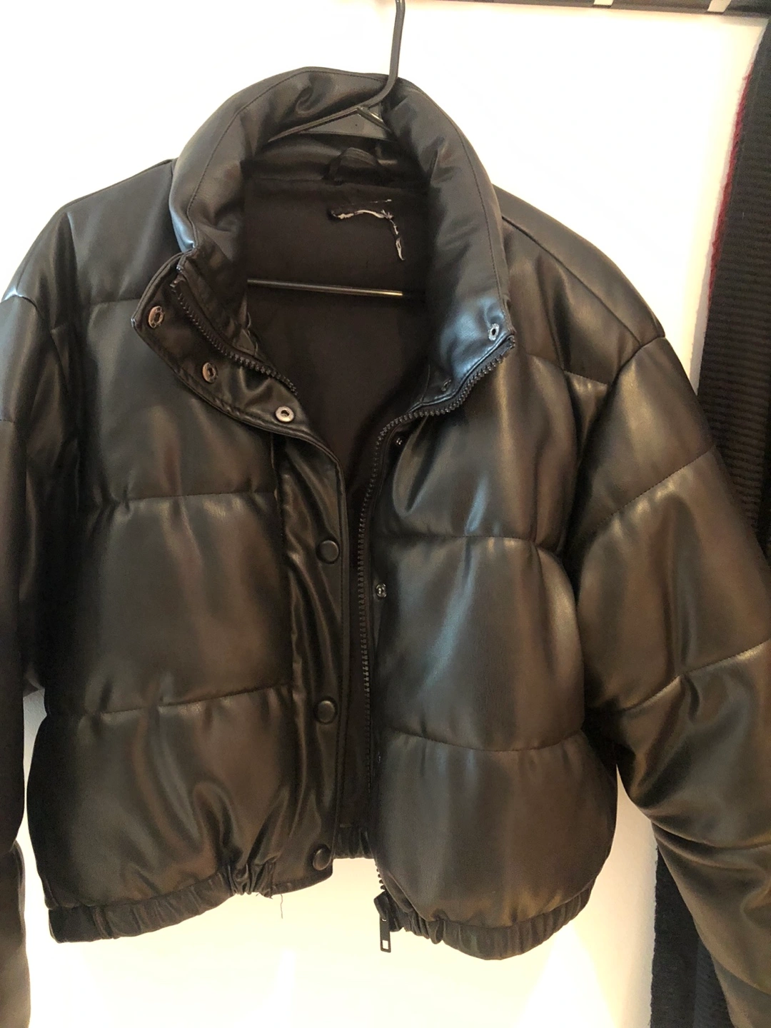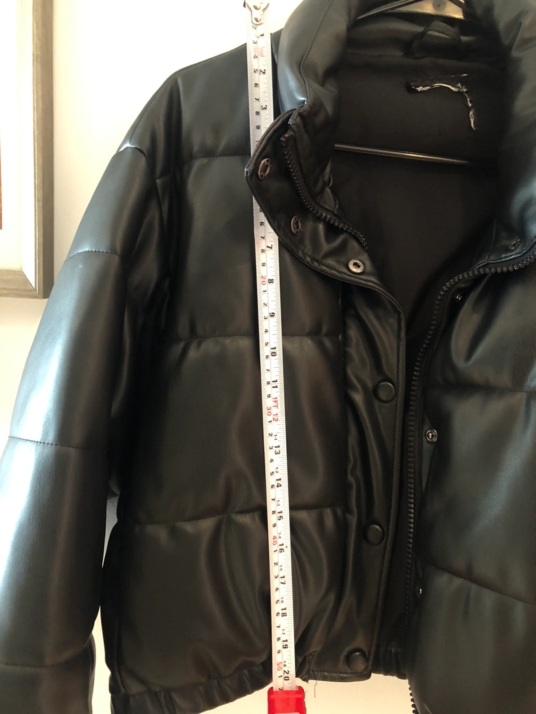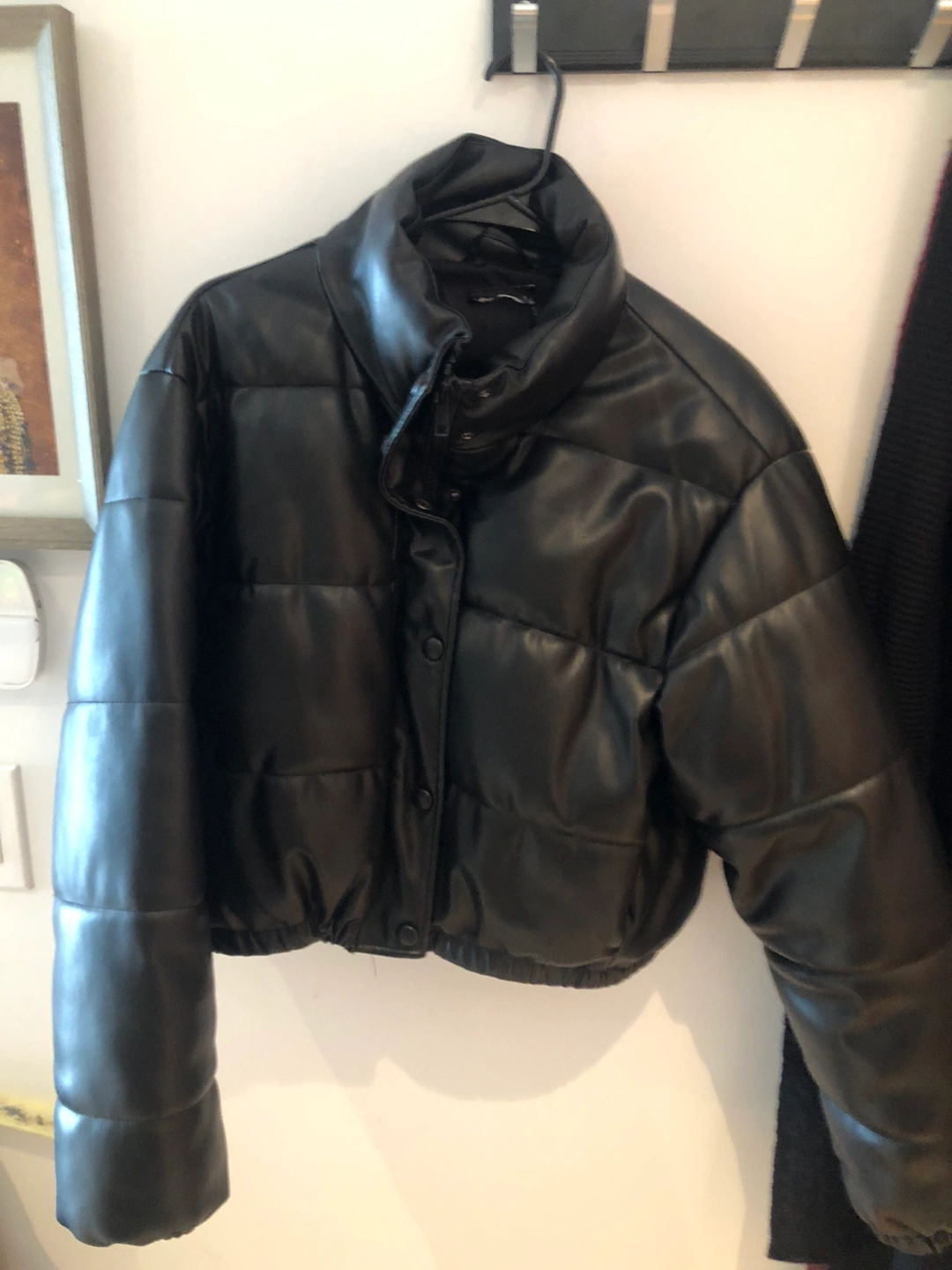 75Size Medium. Faux leather puffer crop jacket - 20-21 inch crop. Gently used with a slight scratch on the back. Comfy and super flattering. Warm enough when layered with a sweater. I removed the tags due to scratching but this is from Zara size medium.