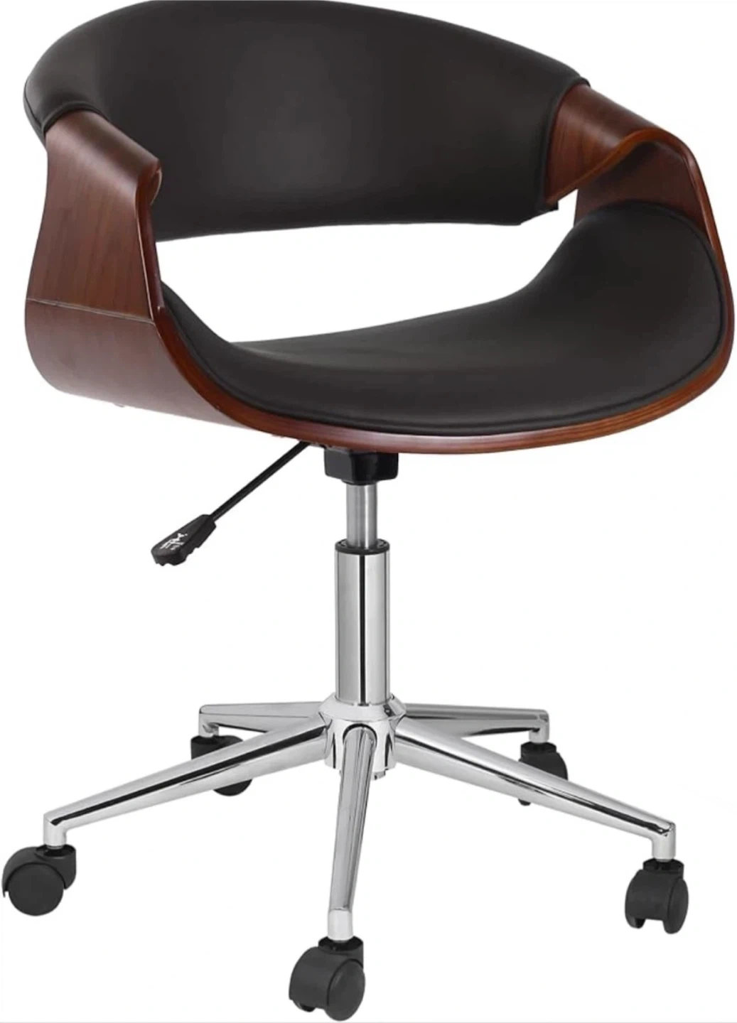 144Selling this stylish office chair! It features a sleek black faux leather seat with a curved wooden frame. The chair is height adjustable and has a swivel base with casters for easy movement. It’s like new! I’m selling because I’m moving.