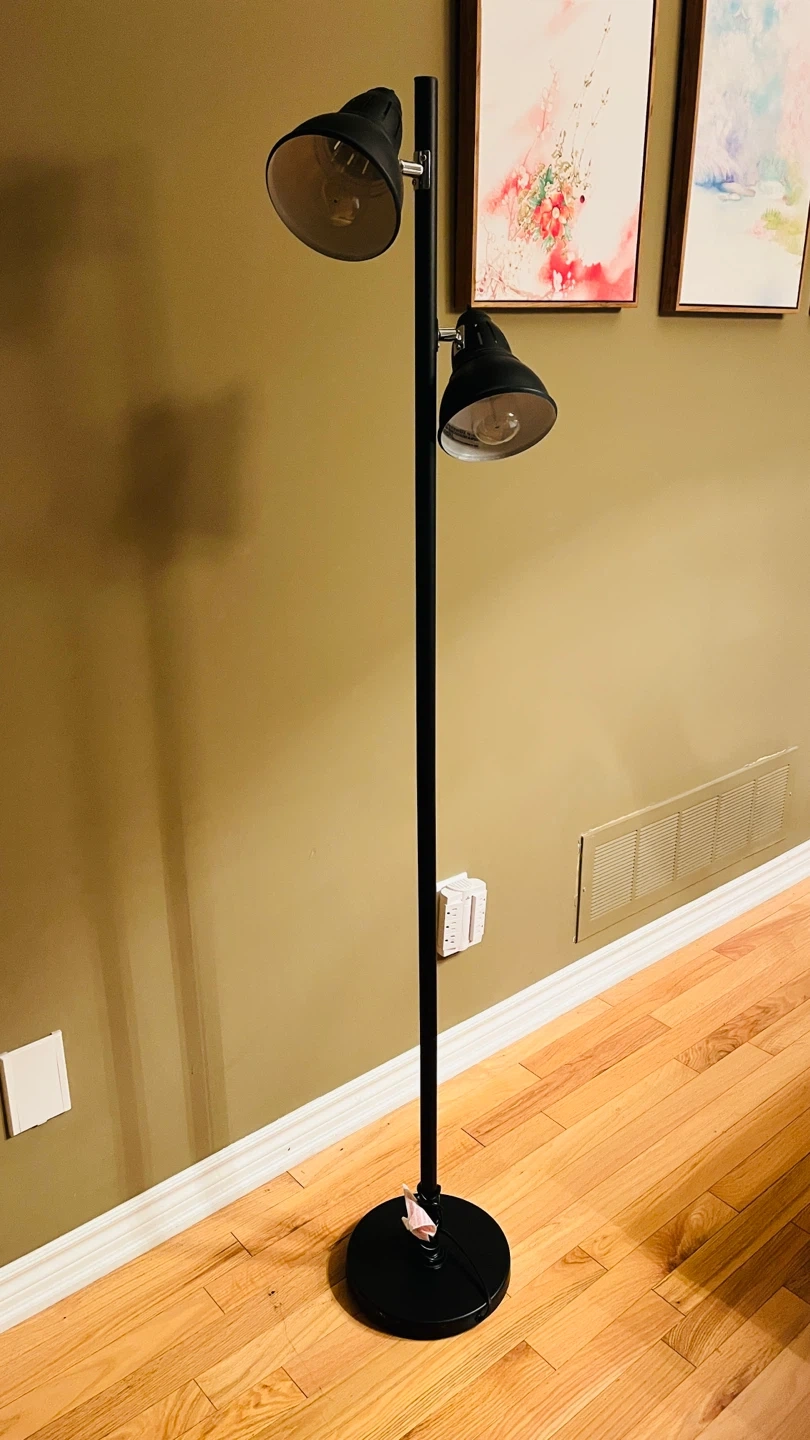 10Selling a black floor lamp with two adjustable lights. It's in great condition and would be perfect for a reading nook or to brighten up any room.