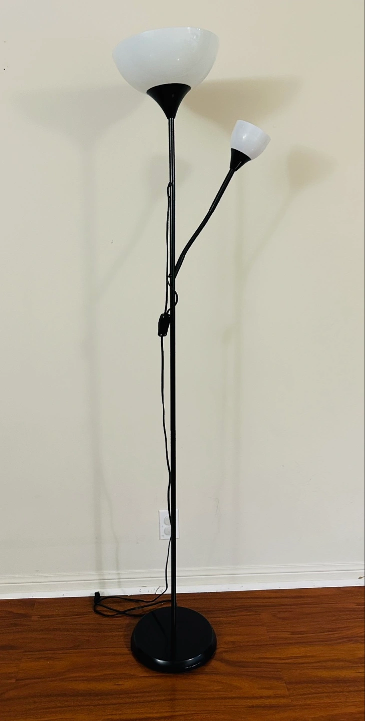 38Selling a floor lamp in good condition! It features a main upward-facing light and a smaller adjustable reading light. The lamp is black and has a round base.