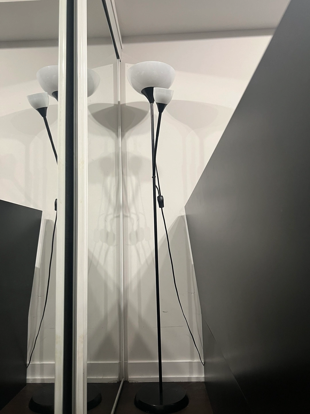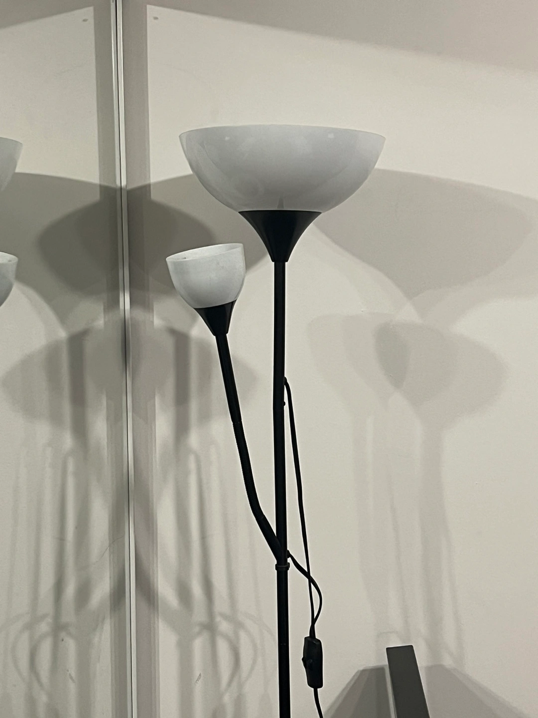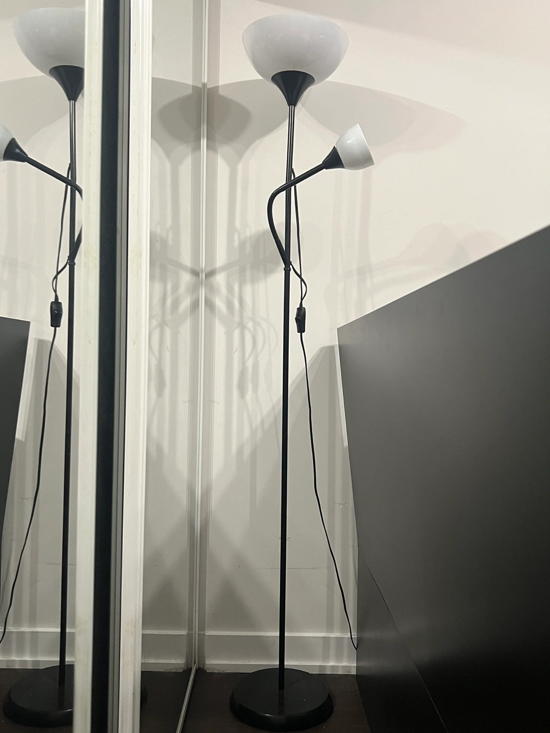 5 ft 7 Black floor lamp with two lights, one large and one smaller (smaller one can be manipulated to face any direction). Uses 2 bulbs: 1 x 40W or smaller 120 volt bulb and 1 x 100W or smaller 120 volt bulb. The lamp has a cord with a switch.