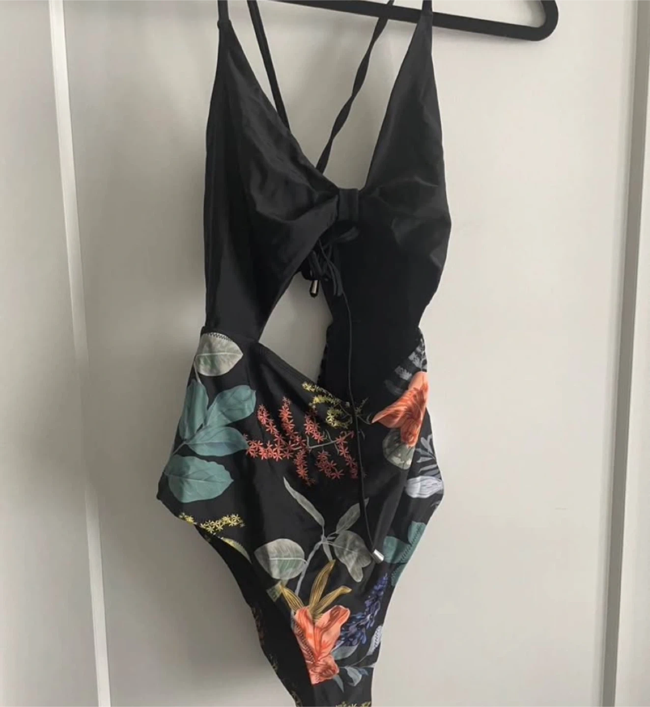 602Cute black one-piece swimsuit with a floral pattern on the bottom. It features a tie at the back and a cutout design. Perfect for the beach or pool!