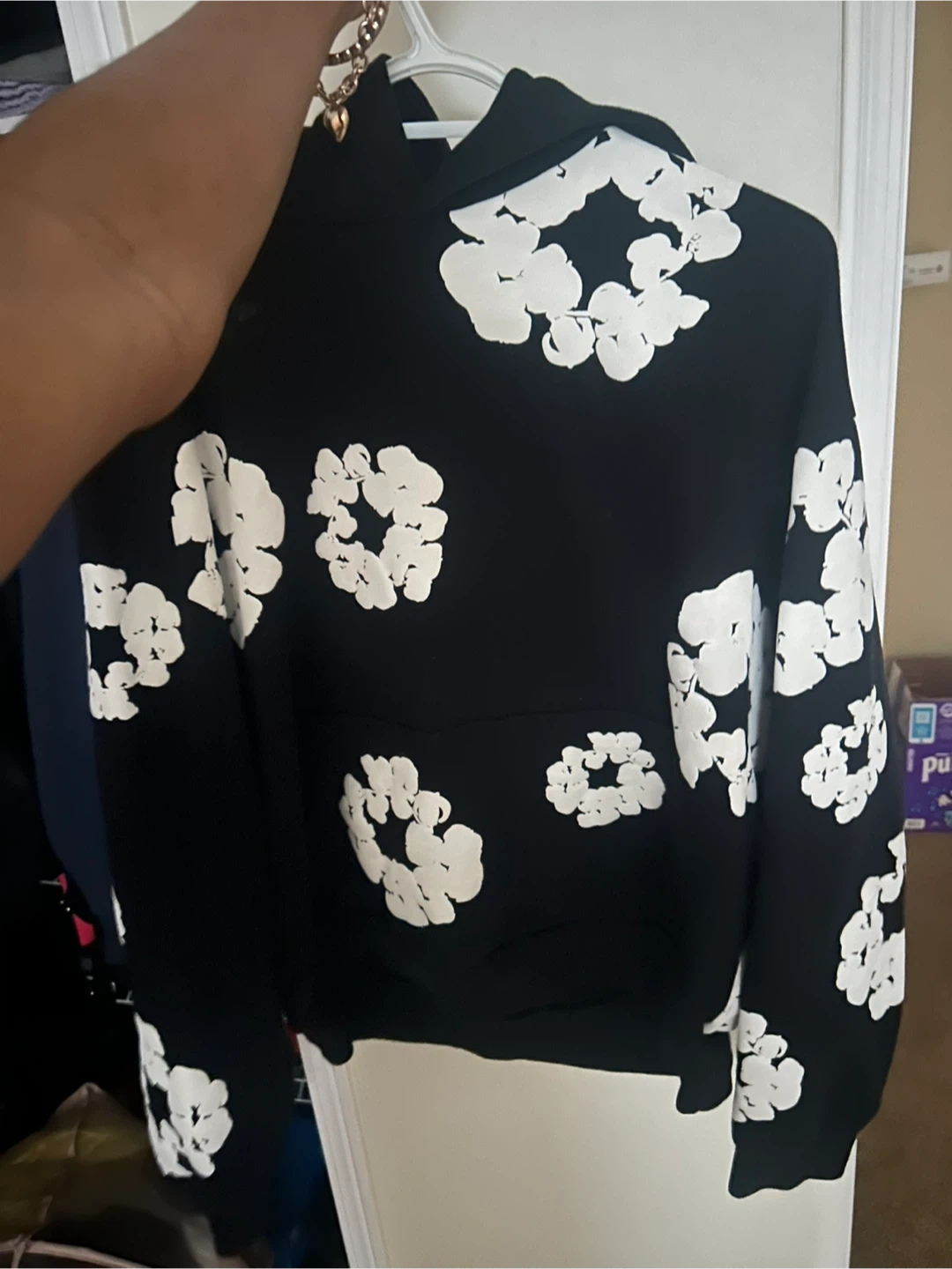 Here's a stylish black long-sleeve top with a unique white floral print! It's in great condition and ready for a new home. Perfect for adding a touch of flair to your wardrobe.
