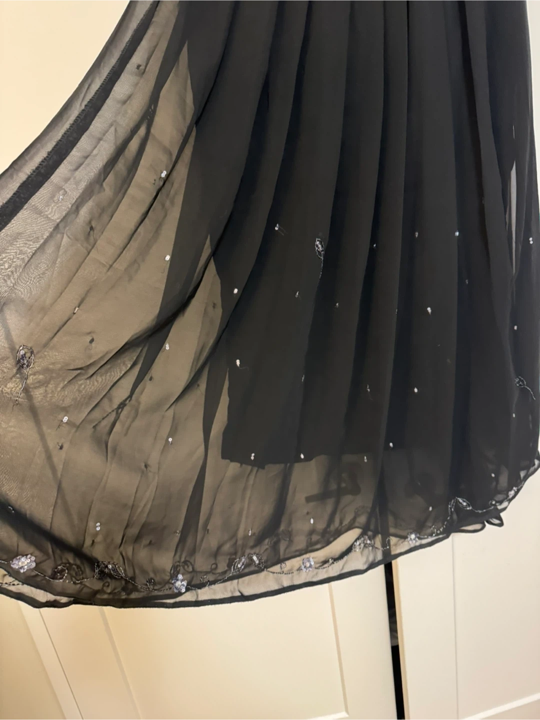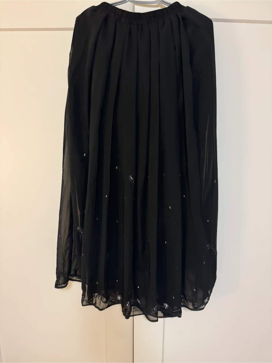 27Flowy black skirt with a sheer overlay and some stone beaded detailing at the bottom. It's in great condition and ready for a new home! Waist 25 inch but flexible due to elastic Length 40 inch