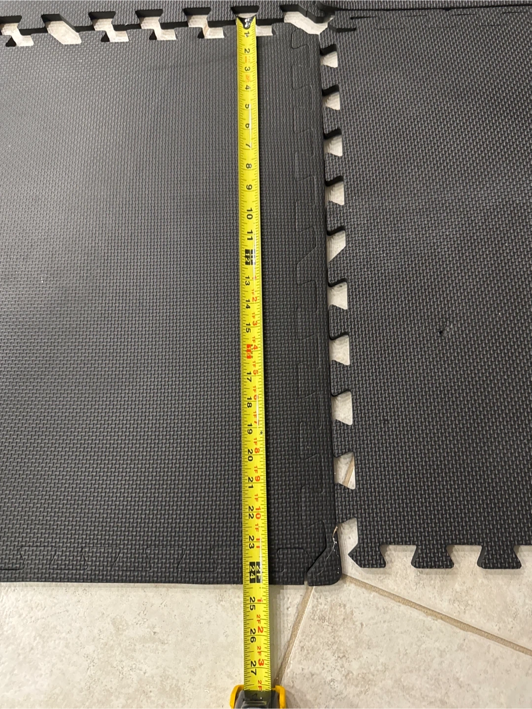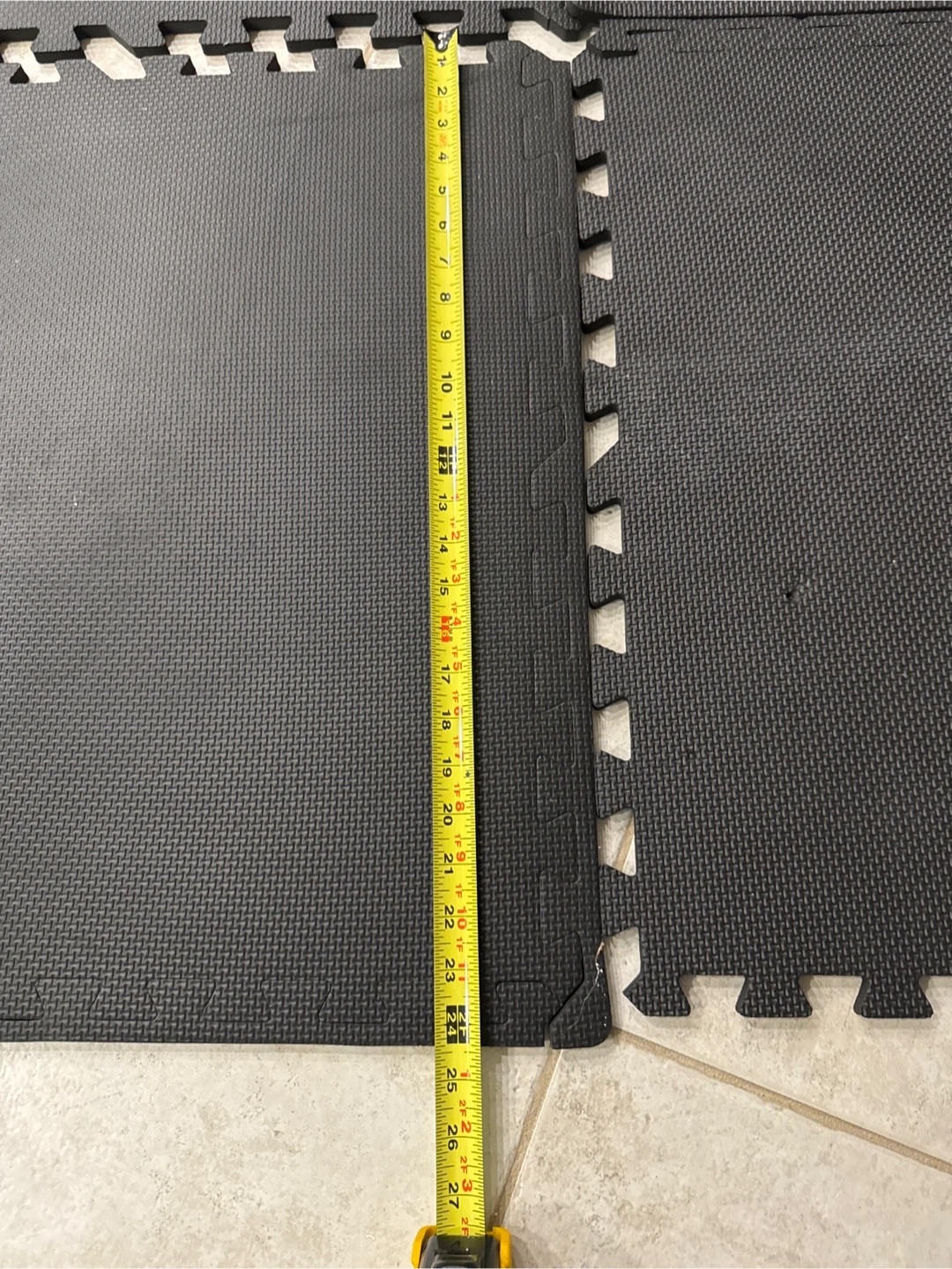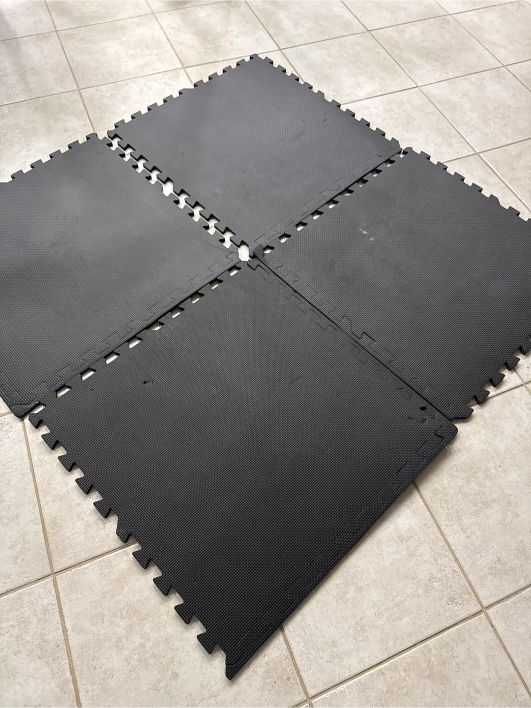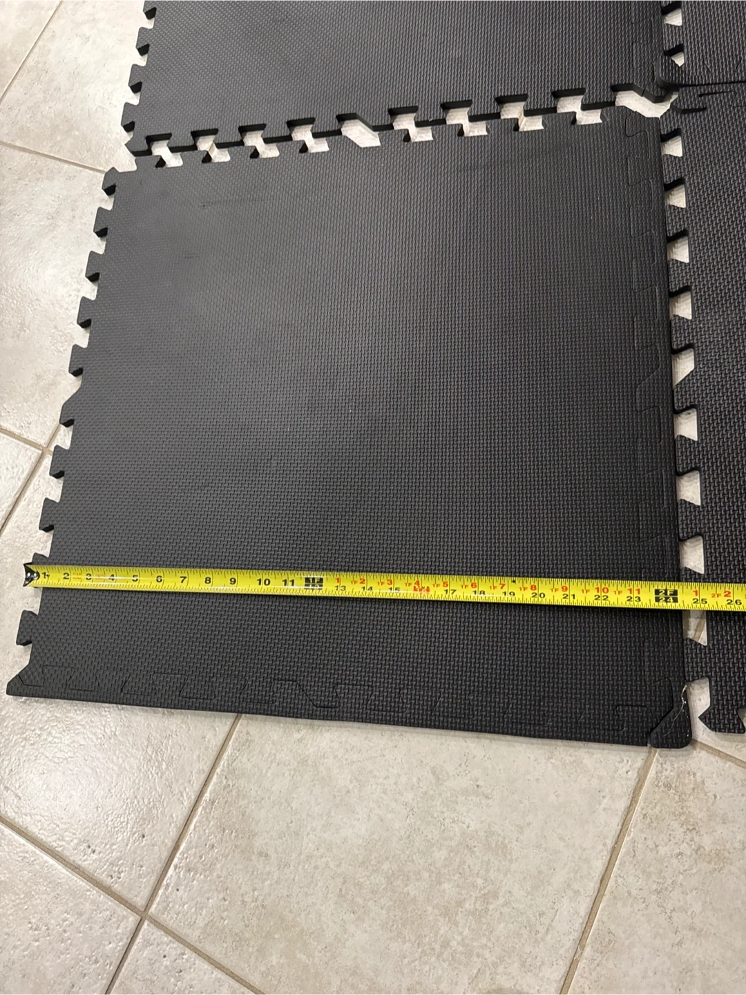 Selling a set of black foam interlocking floor mats. Each mat is approximately 24x24 inches. Great for creating a cushioned surface for workouts or play areas!