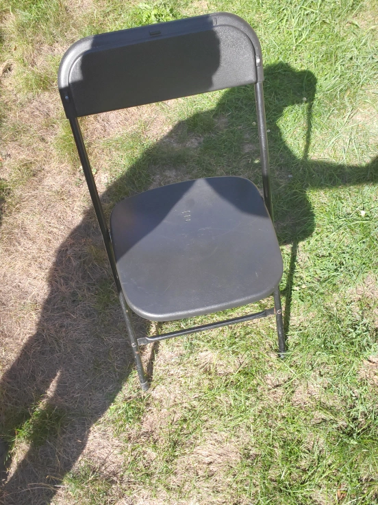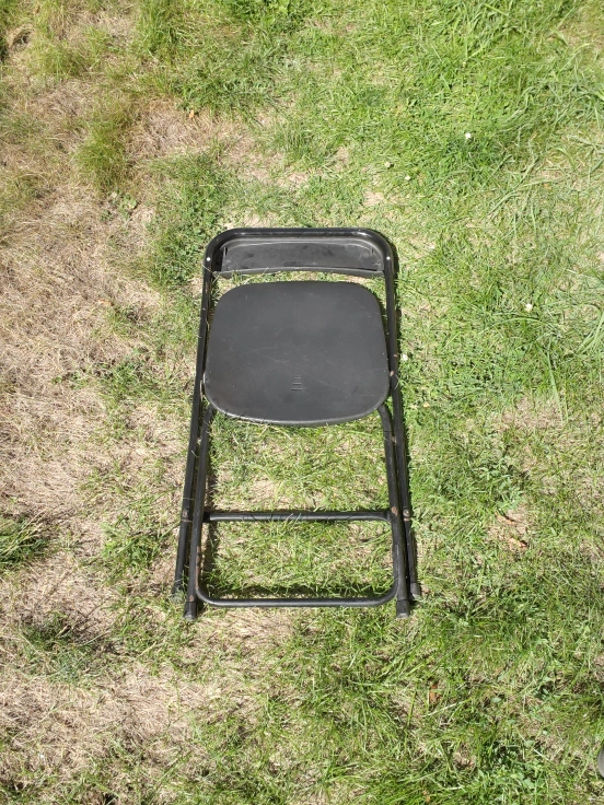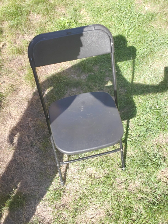 I'm selling a handy black folding chair! It's perfect for when you need some extra seating for guests or events. It's in good condition and folds up easily for convenient storage when not in use