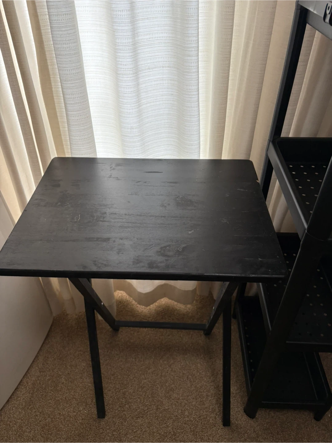 Selling a handy black folding table and a matching shelf unit! Both are in great shape and perfect for adding extra surface area and storage to any room. The table folds up easily for storage when not in use, and the shelf is great for organizing your things