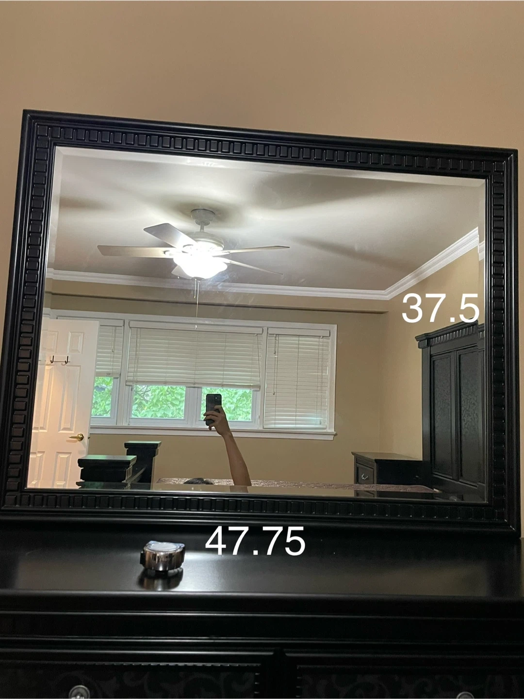 Selling a large black framed mirror. The dimensions are approximately 47.75 inches wide and 37.5 inches tall. It's in great shape and ready to add some style to your space!