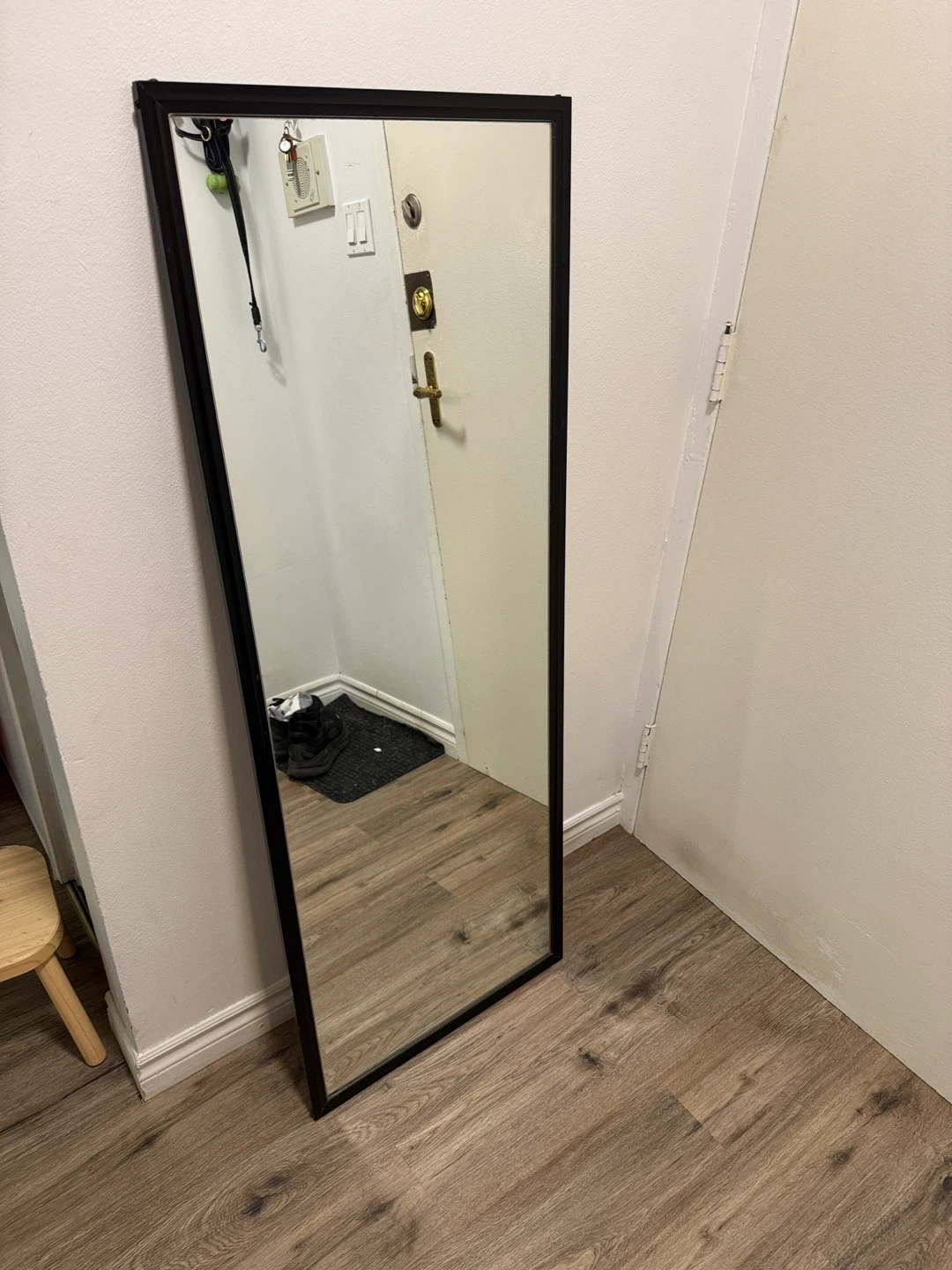 10Selling a mirror with a sleek black frame! It's in great condition and ready to brighten up your space. Perfect for adding a touch of elegance to any room. Measures 54 inches tall and 20.5 inches width. It has heaviness to it.
