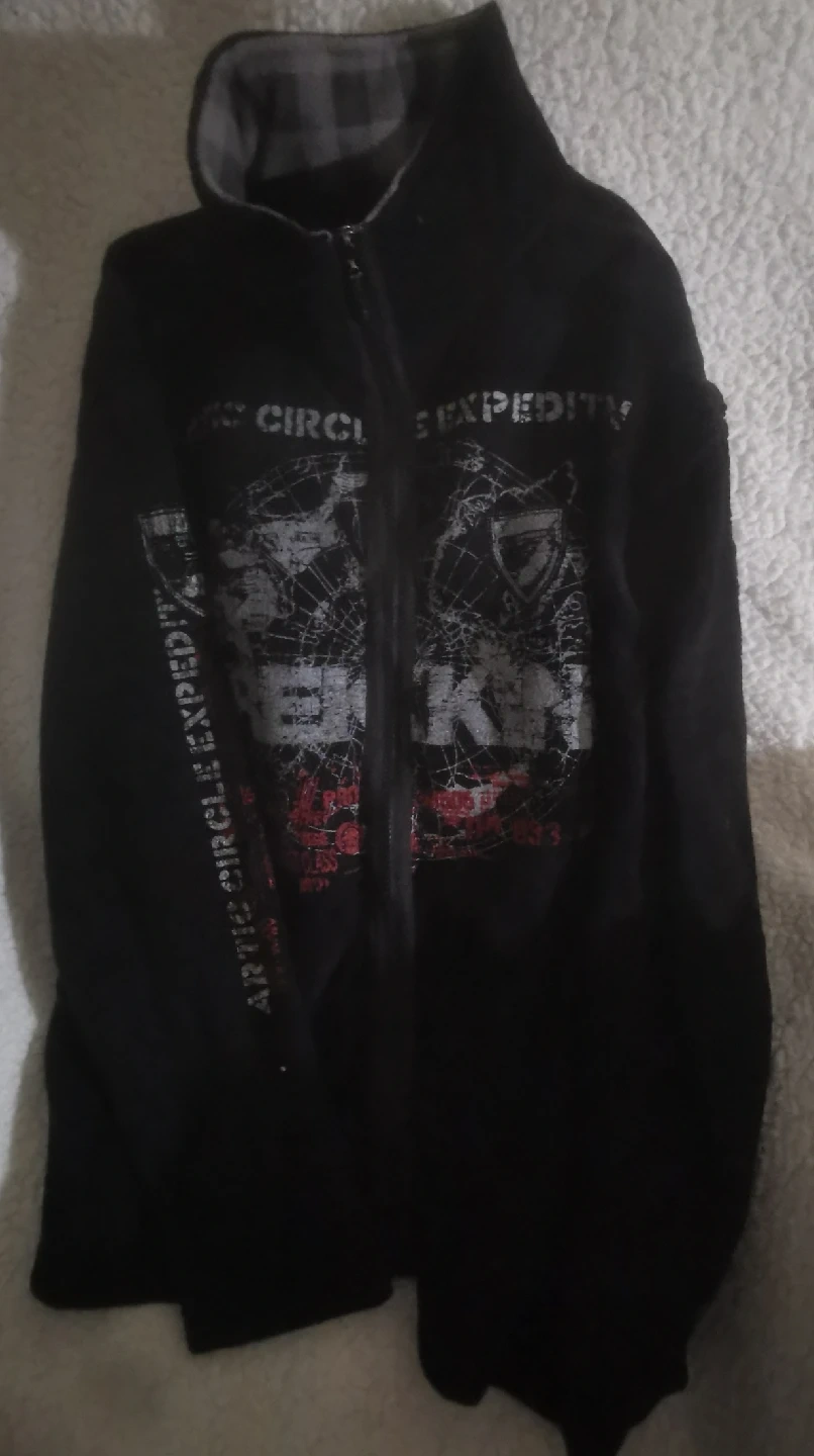 Selling a black full zip hoodie. It has a cool design on the front and sleeve. Great for layering or wearing on its own!