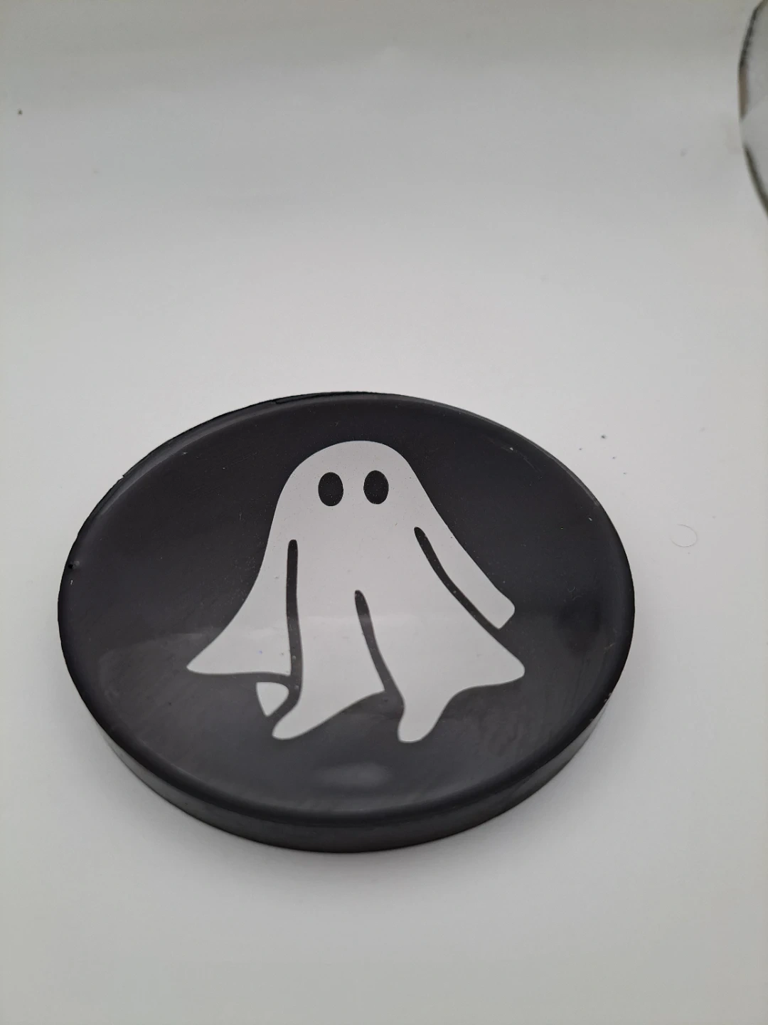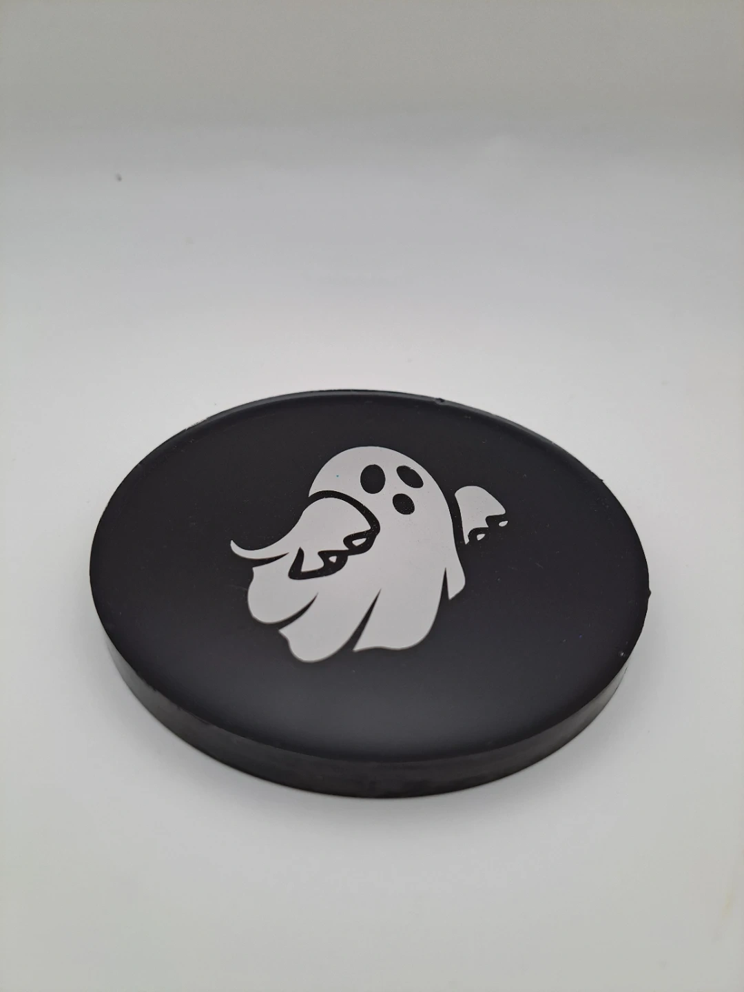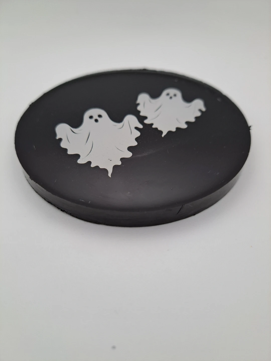 10Selling a set of black coasters with ghost designs. They are handmade from resin and would be perfect for Halloween or any time you want a spooky touch to your drinkware! Comes with your choice of non slip feet or a holder!
