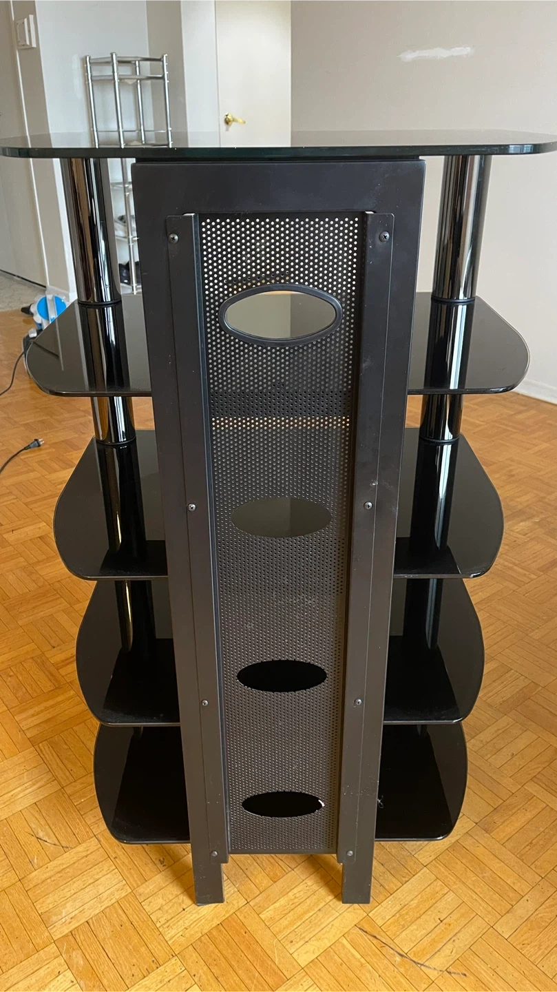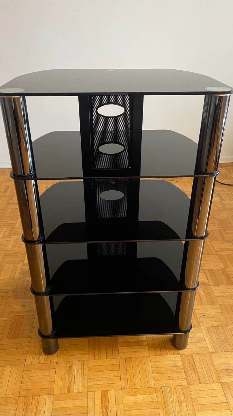 Selling a black glass shelf unit. It has a sleek design with multiple shelves, perfect for displaying items or organizing your space. The shelves are made of black glass, adding a touch of elegance to any room. It's in great condition and ready for a new home!
