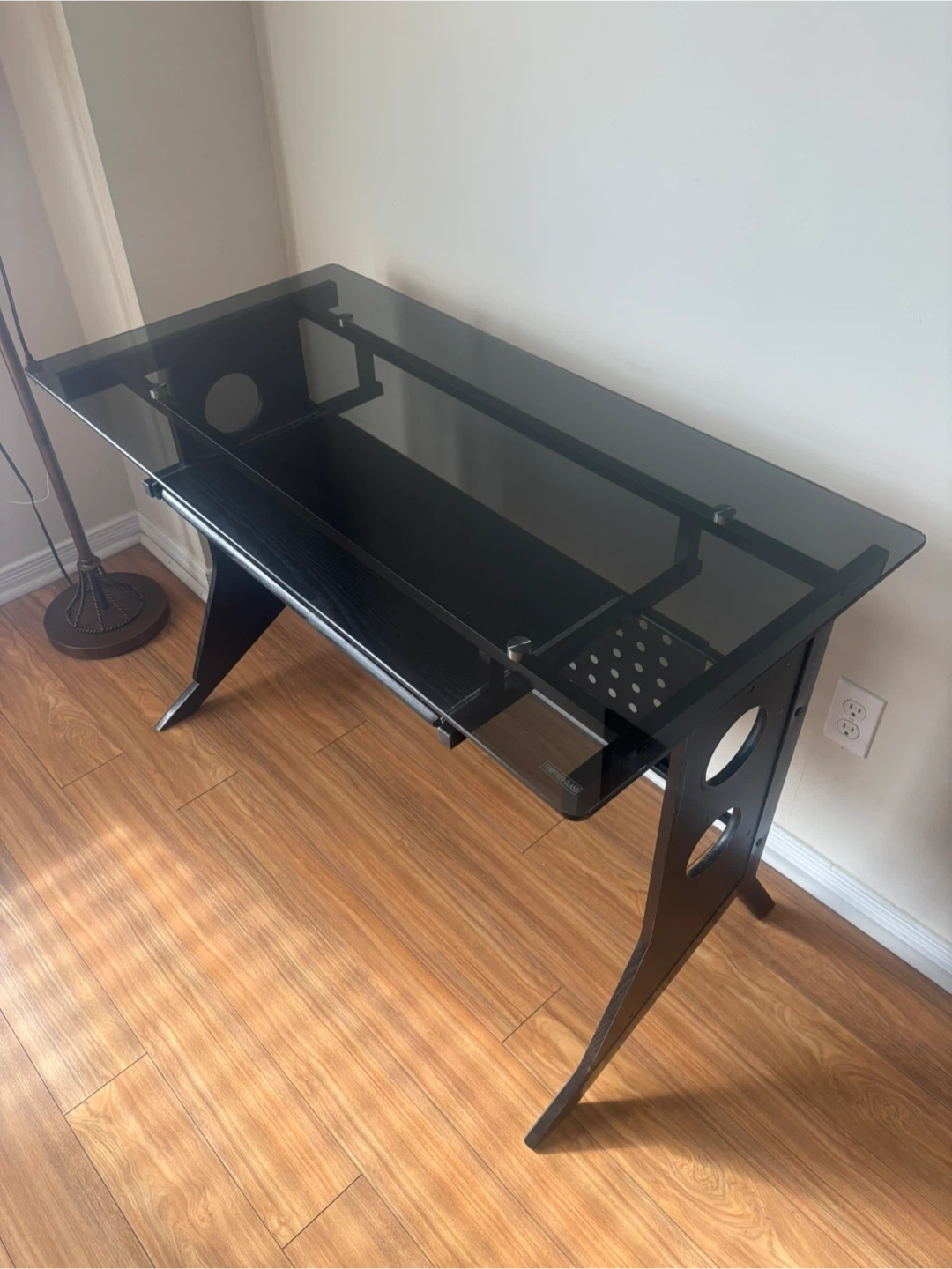 10Selling a black glass top computer desk! It's in great condition and would be perfect for a home office or study space. The desk features a sleek design with a glass top and a pull-out keyboard tray. It's sturdy and provides ample space for your computer and accessories