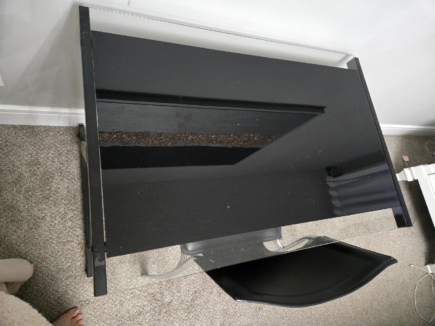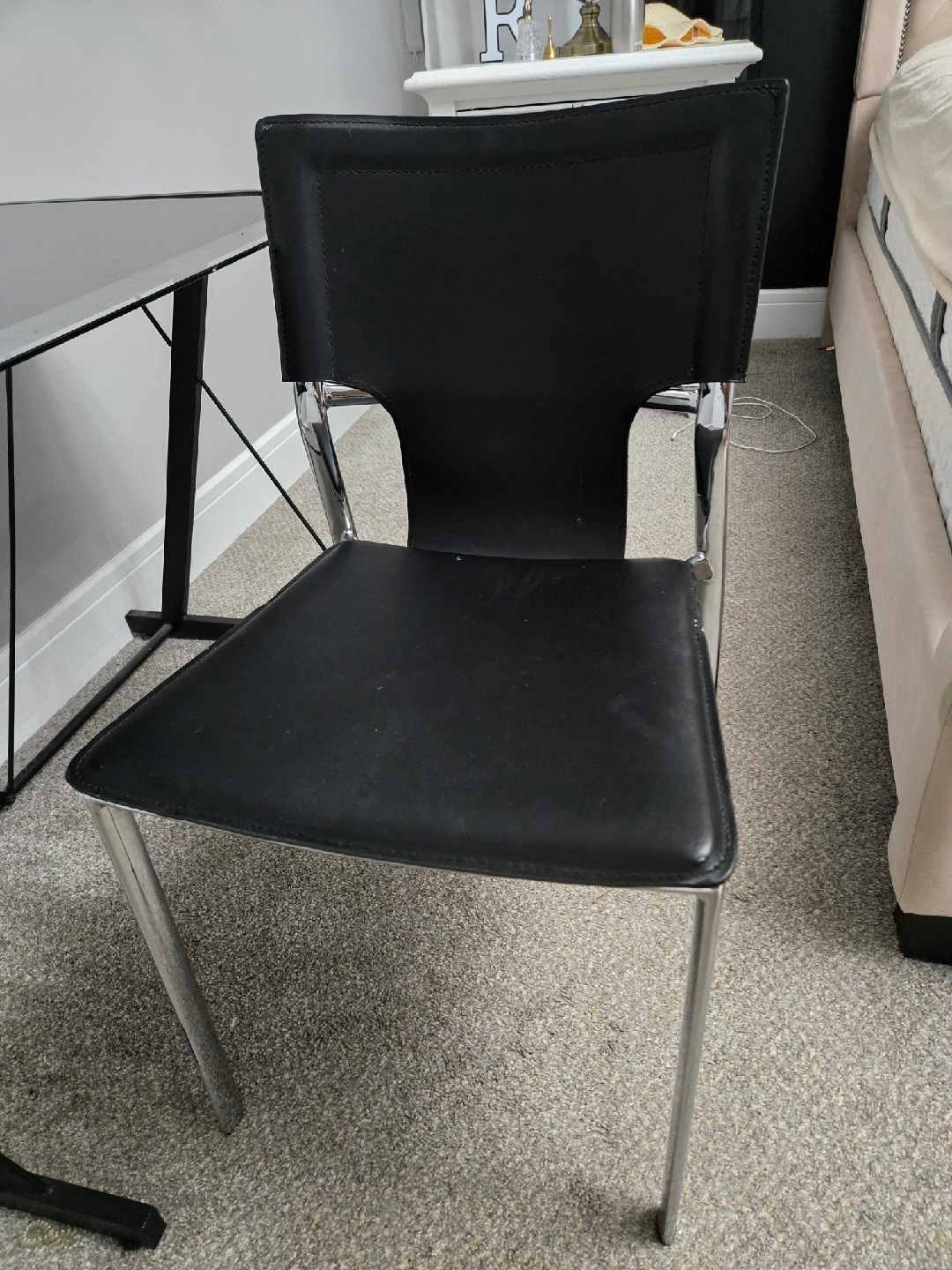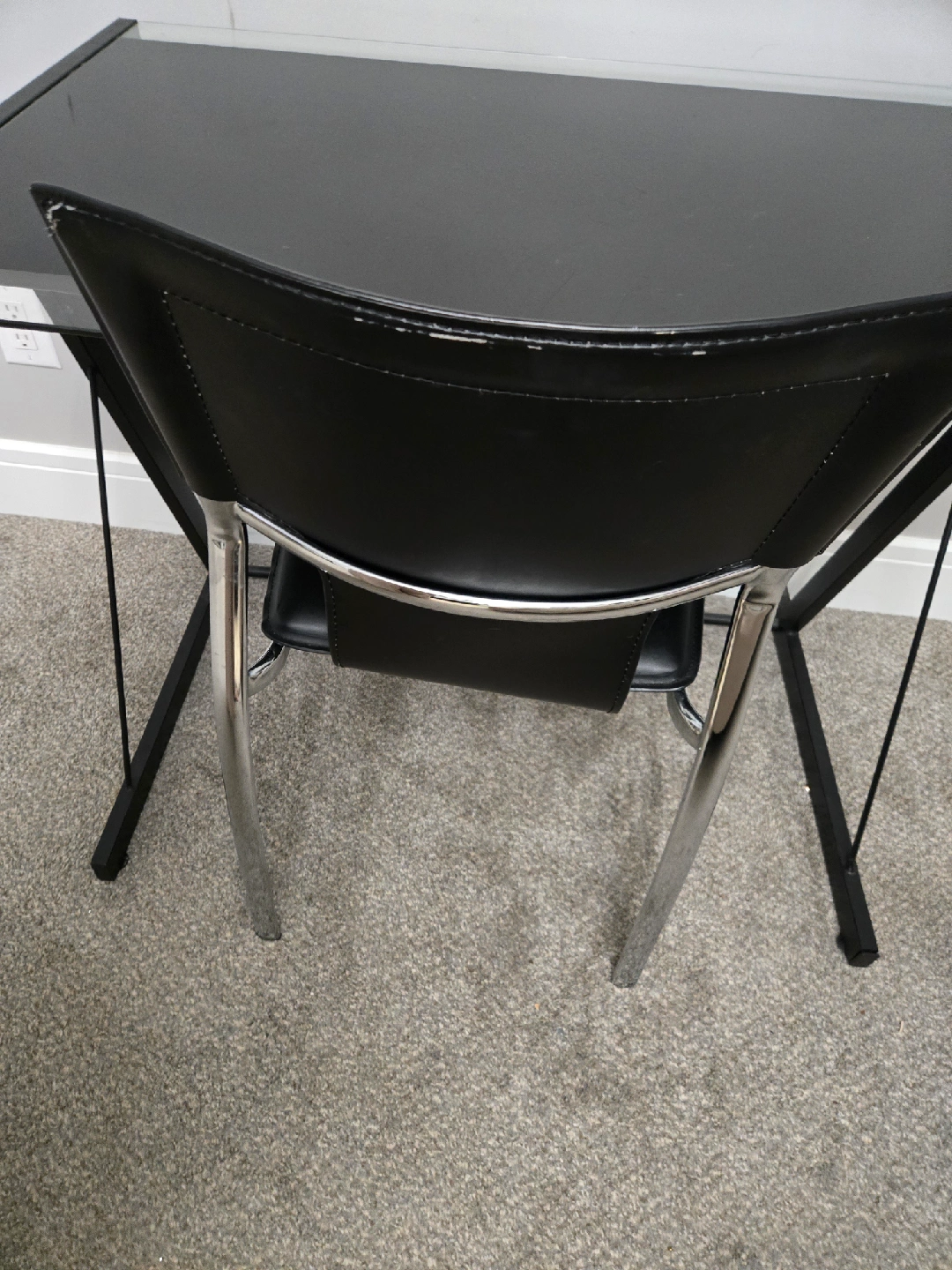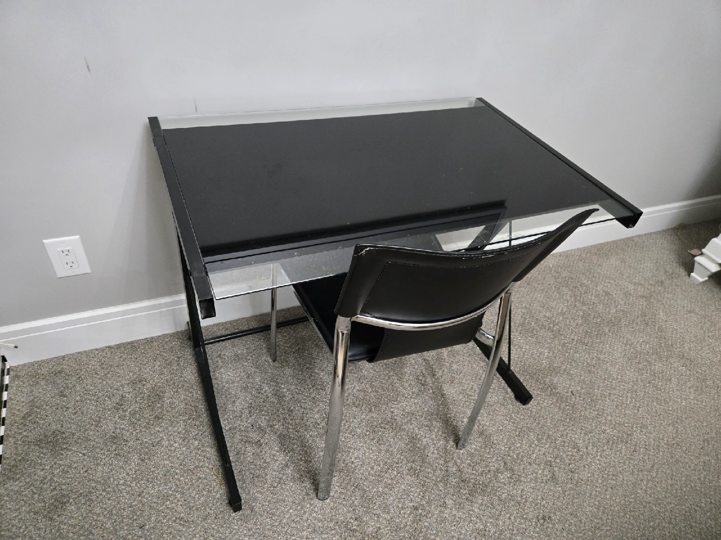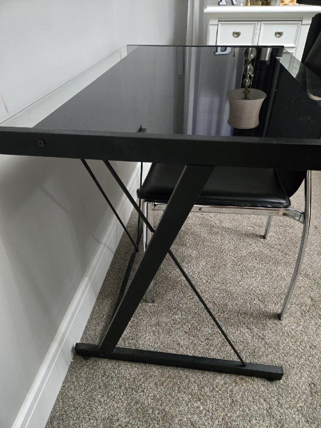 10Selling a desk with a black glass top and a matching chair. The chair has a black leather seat and a chrome frame. It's a stylish set, perfect for a home office or student space. The desk has a modern look with its sleek glass top and sturdy metal frame. Both are in good condition!