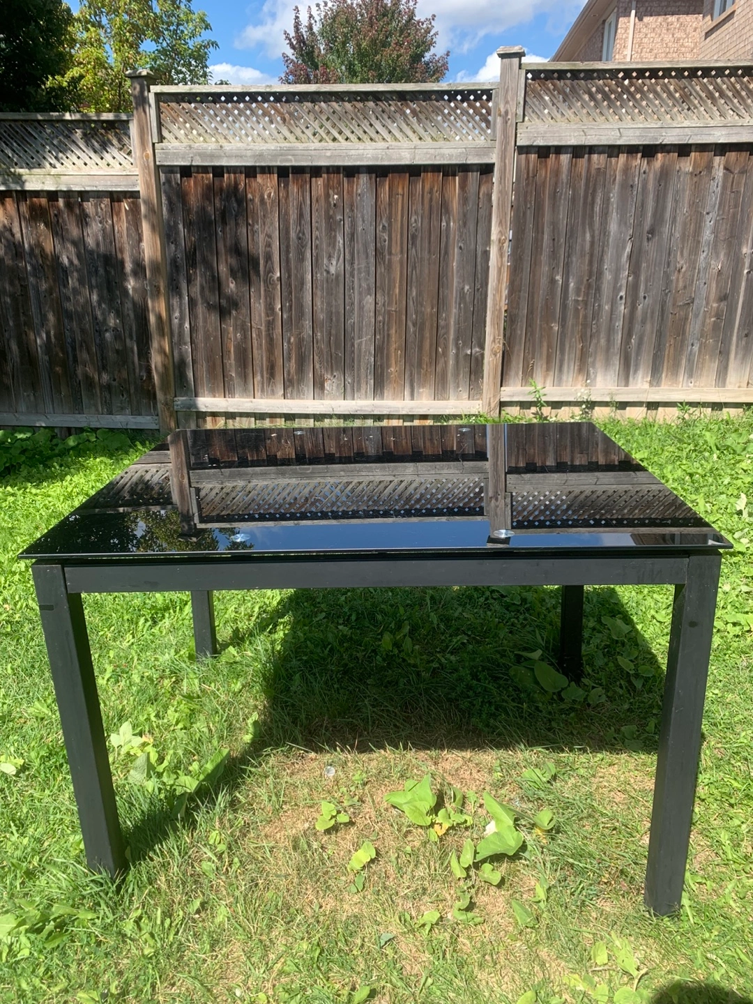 72Selling a black dining table with a glass top with 4 chairs. It's in good condition and would be great for a small dining area or kitchen nook! The sleek design will fit in with any decor
