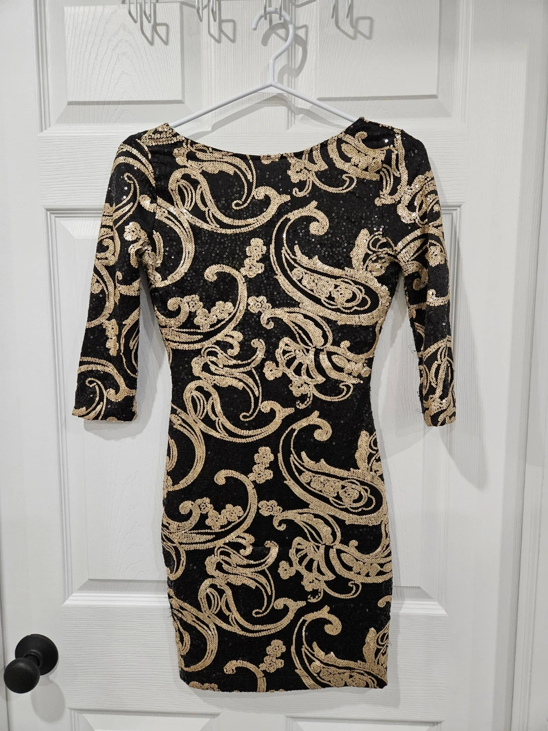 33Selling a beautiful black and gold dress from Revamped! It's a size small and features a stunning paisley-like pattern. Perfect for a night out or special occasion!