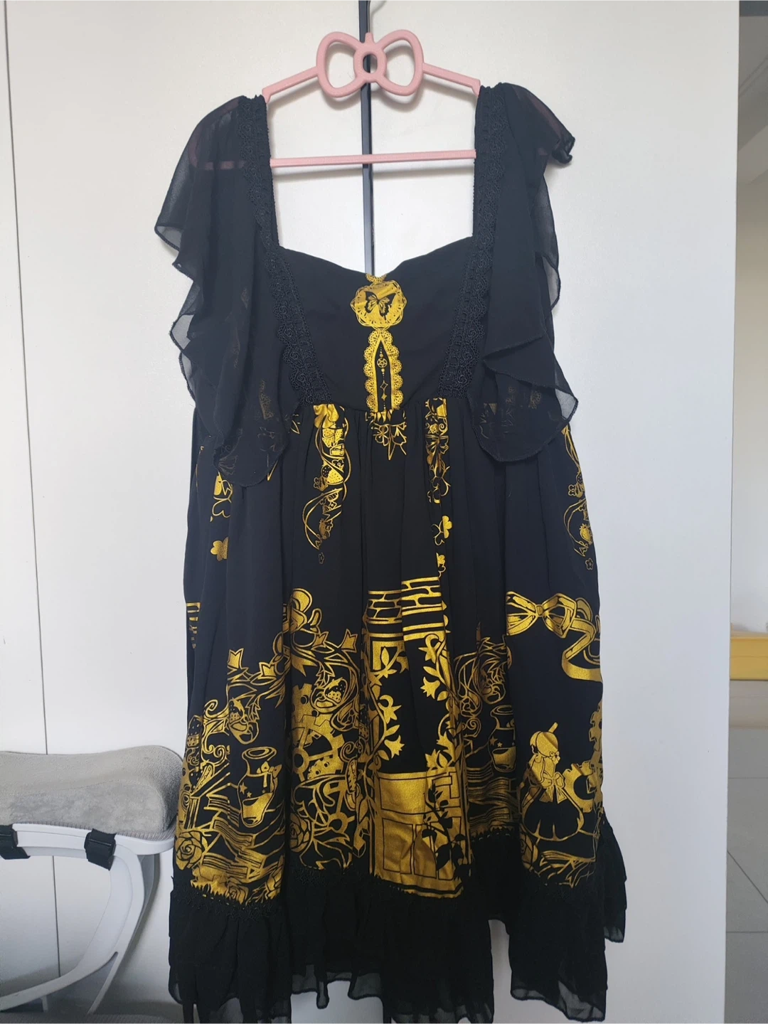 Selling a beautiful black and gold Lolita dress! It features intricate gold detailing on a black background and ruffled accents. The material is lightweight and flowy, perfect for a special occasion or adding a unique touch to your wardrobe. There is a bit broken like third picture shows