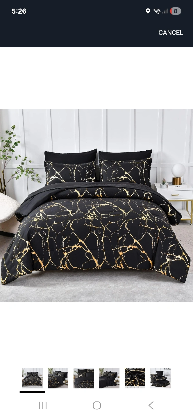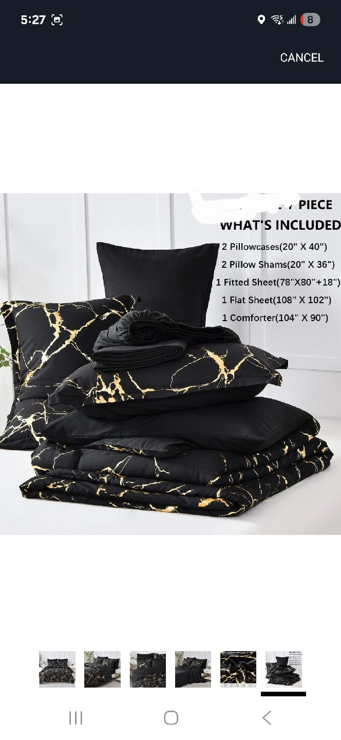 Add a touch of elegance to your bedroom with this beautiful black and gold marble pattern bedding set! This set includes: - 2 Pillowcases - 2 Pillow Shams - 1 Fitted Sheet - 1 Flat Sheet - 1 Comforter Lightly used
