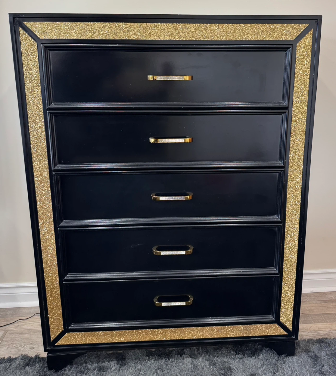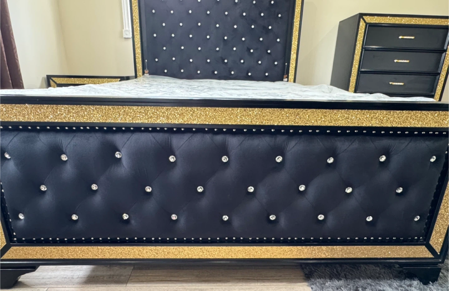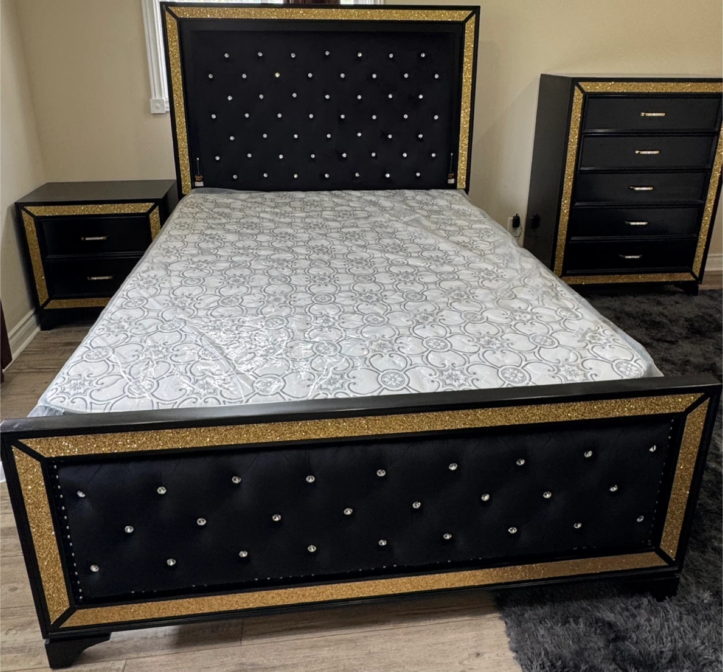 Looking to add some glam to your bedroom? I'm selling a beautiful 5-piece queen bedroom set. It includes a bed frame, mattress, 1 nightstand,1 chester draw, a dresser, and a mirror. The set features a black finish with gold glitter accents and diamond-like button tufting. The bed frame also has LED lighting.It's in great condition and ready for a new home! Ready For Pick Up. Price is negotiable!
