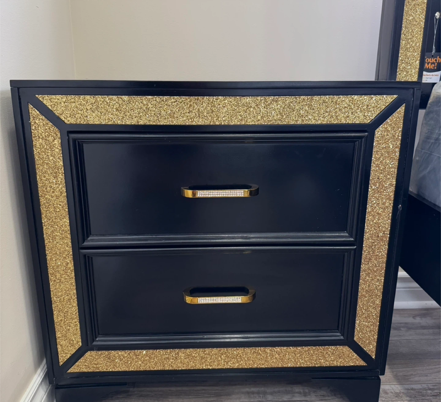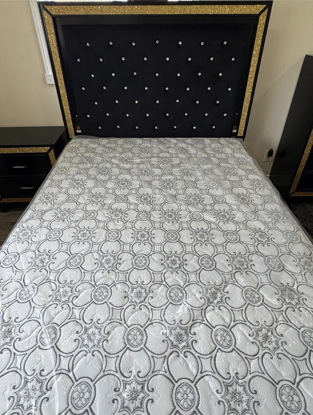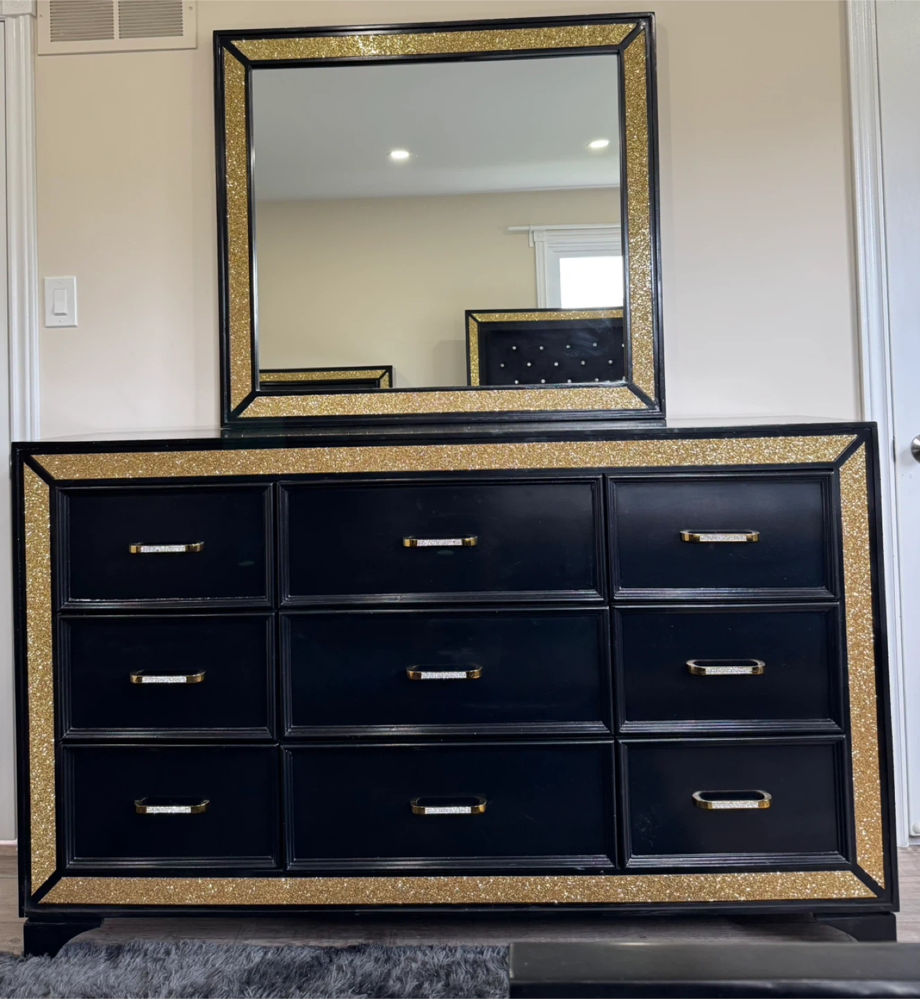 Looking to add some glam to your bedroom? I'm selling a beautiful 5-piece queen bedroom set. It includes a bed frame, mattress, 1 nightstand,1 chester draw, a dresser, and a mirror. The set features a black finish with gold glitter accents and diamond-like button tufting. The bed frame also has LED lighting.It's in great condition and ready for a new home! Ready For Pick Up. Price is negotiable!